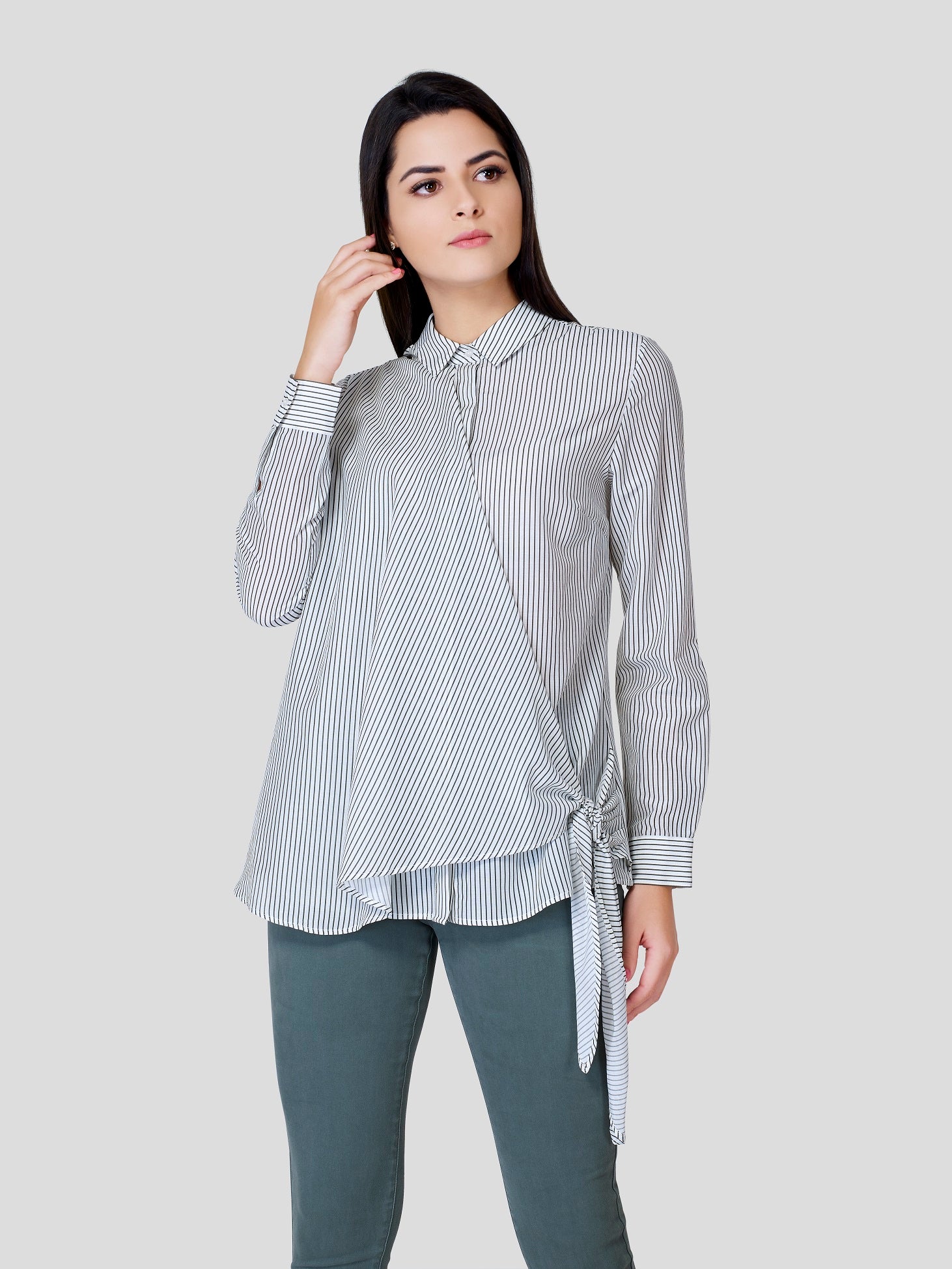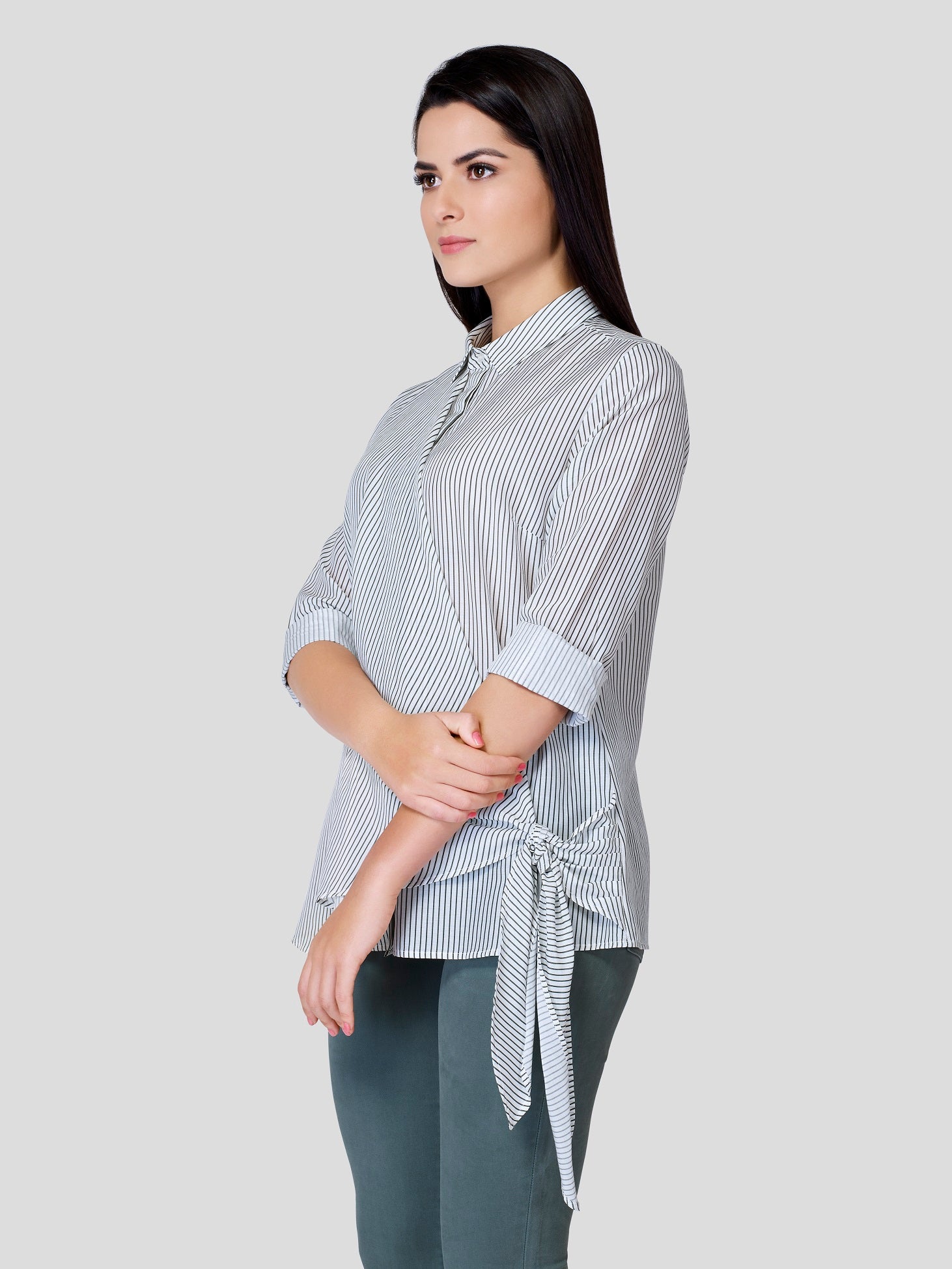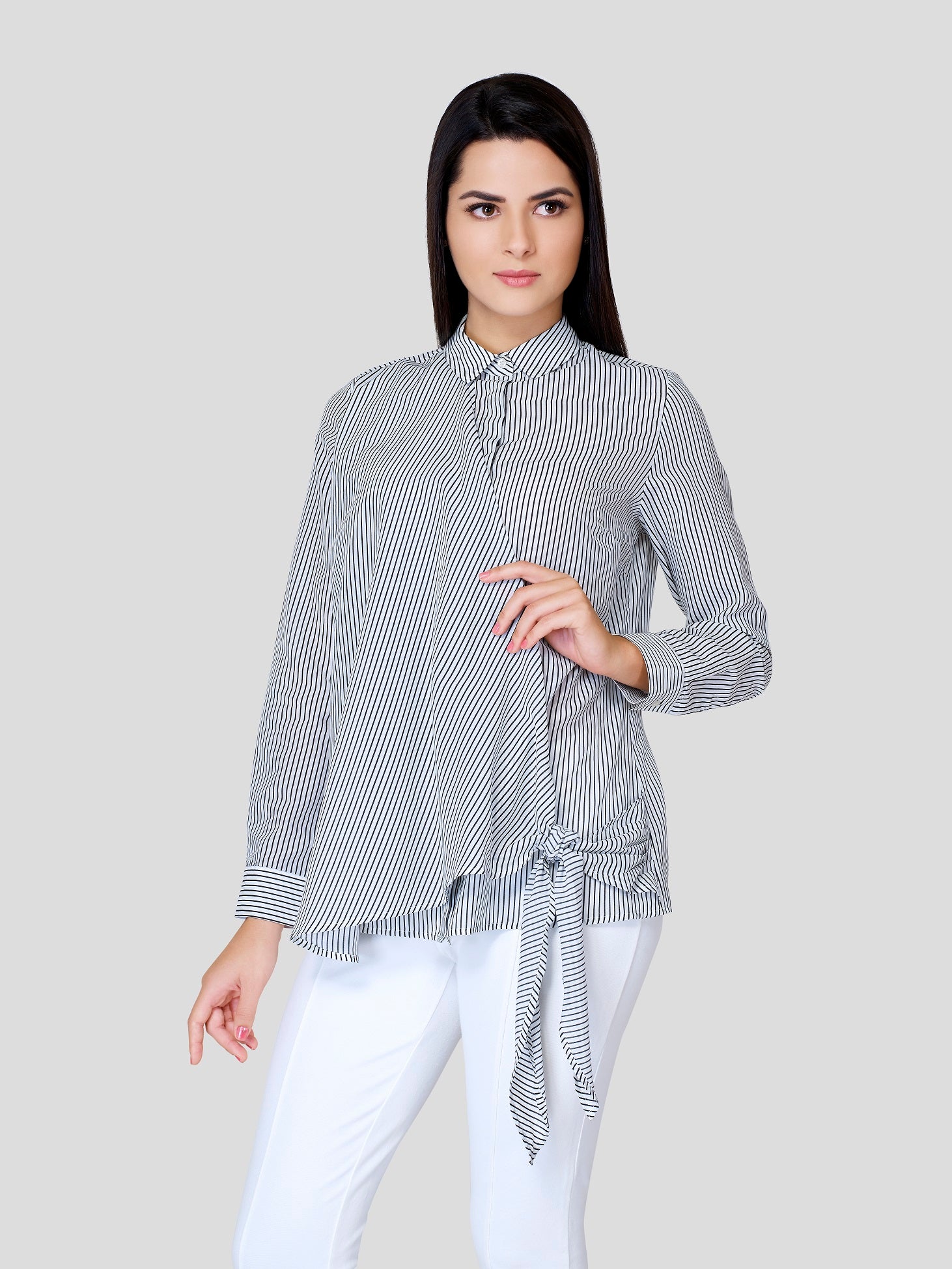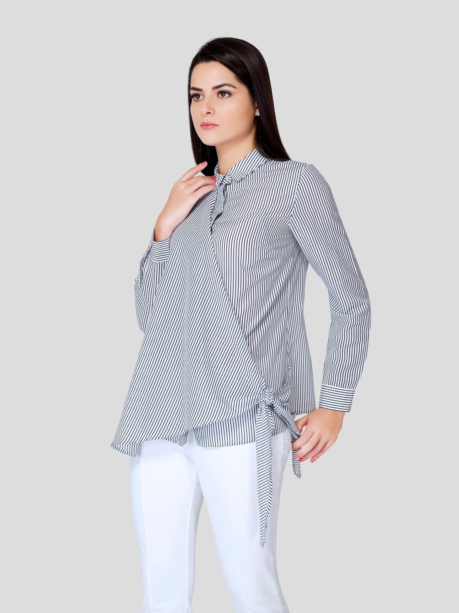 Knotty Comfort - Knotted and draped front buttoned shirt to allow you to look tidy, stylish and creative without compromising on easiness. The lusturous stripped fabric and silky affect used for added richness.