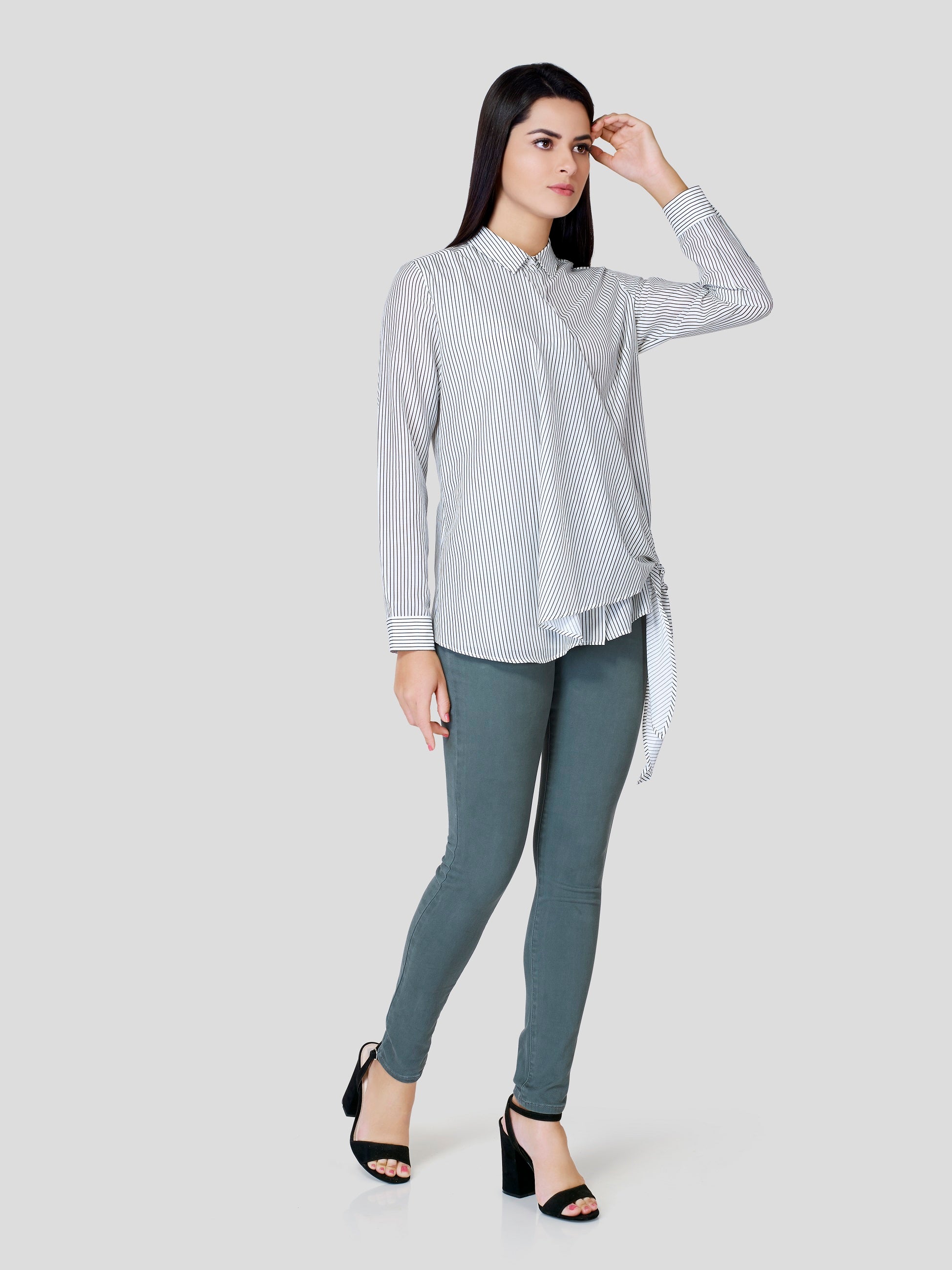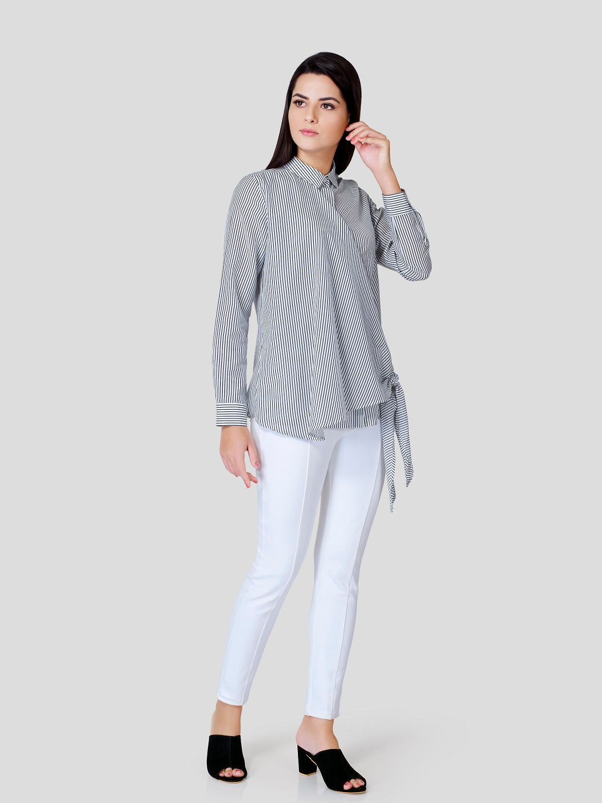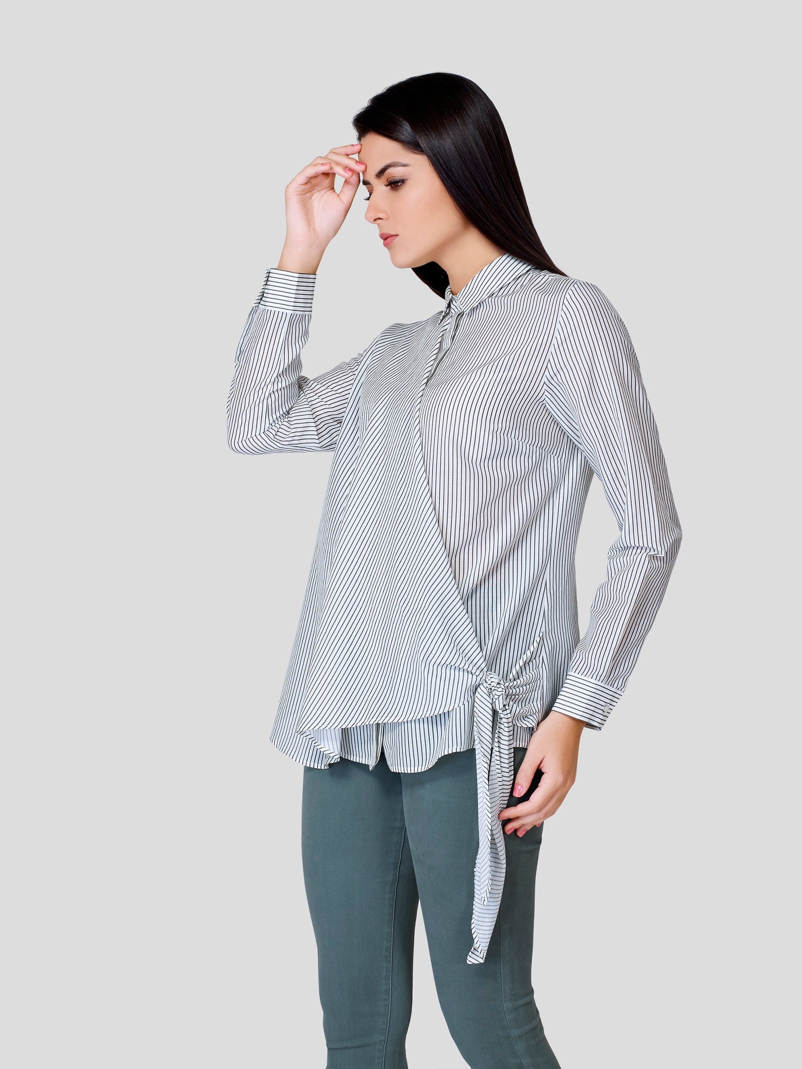 Knotty Comfort - Knotted and draped front buttoned shirt to allow you to look tidy, stylish and creative without compromising on easiness. The lusturous stripped fabric and silky affect used for added richness.