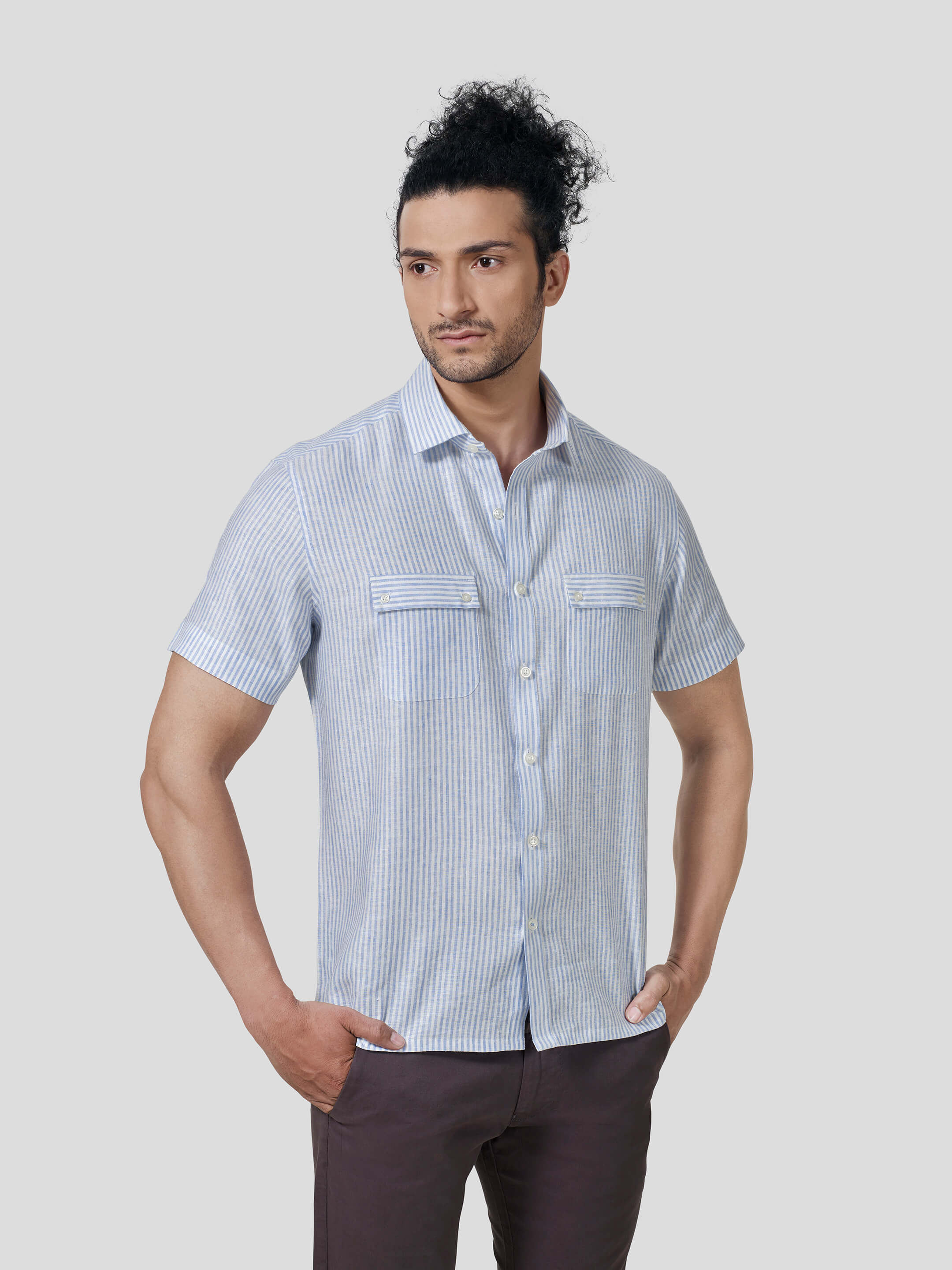 Pursuit : Choosing finest linen striped fabric to design a short sleeve spread collar shirt is a way to attract those who always live In pursuit of excellence. Beside finest natural linen this untuck fit shirt is designed with American Placket, flapped patch pockets with diagonal buttonholes. Now enjoy a casually formal attitude in untuck fit style of business moments.