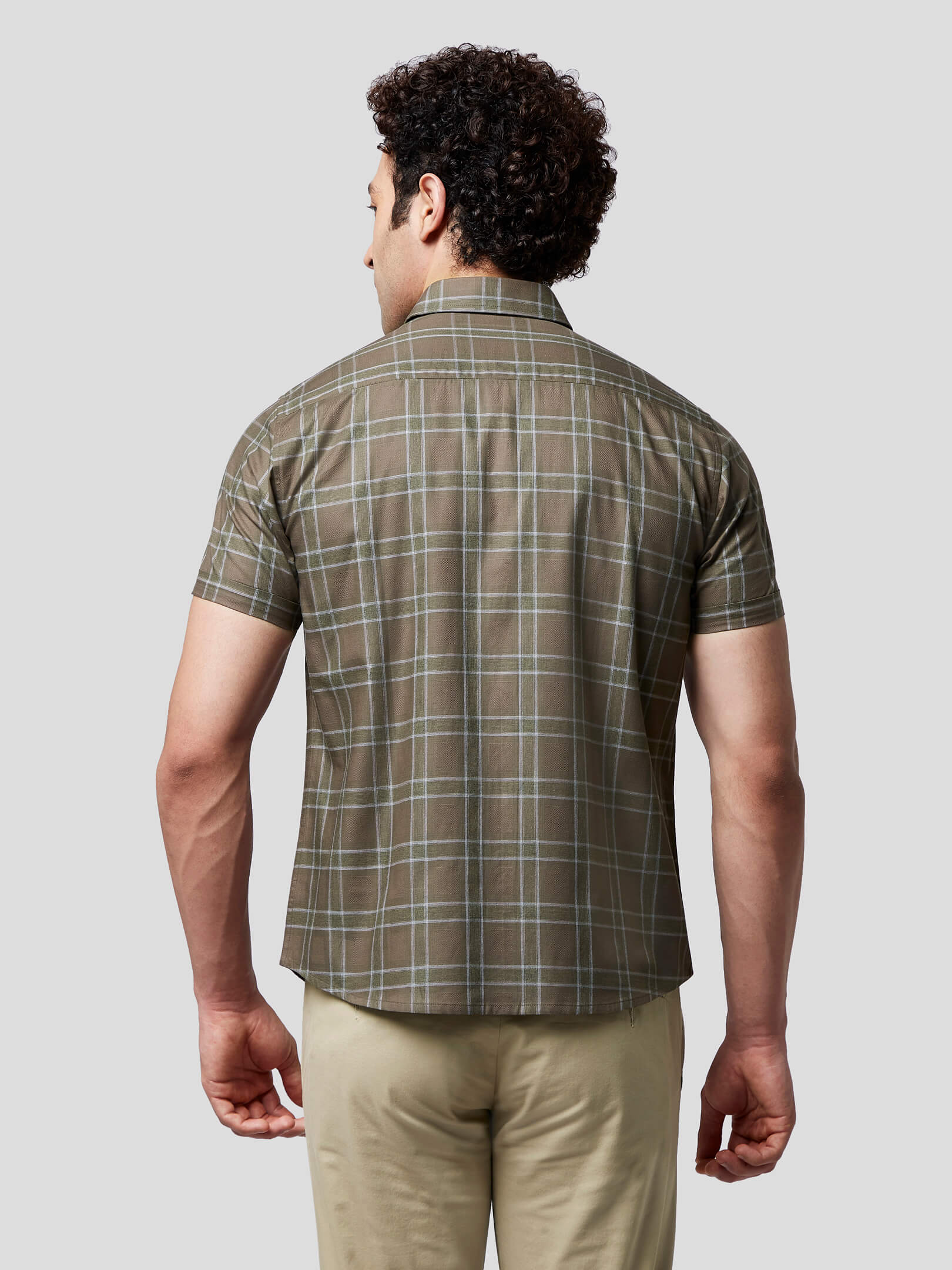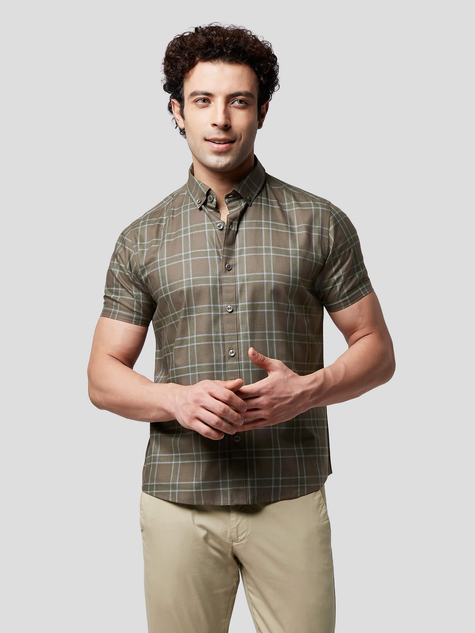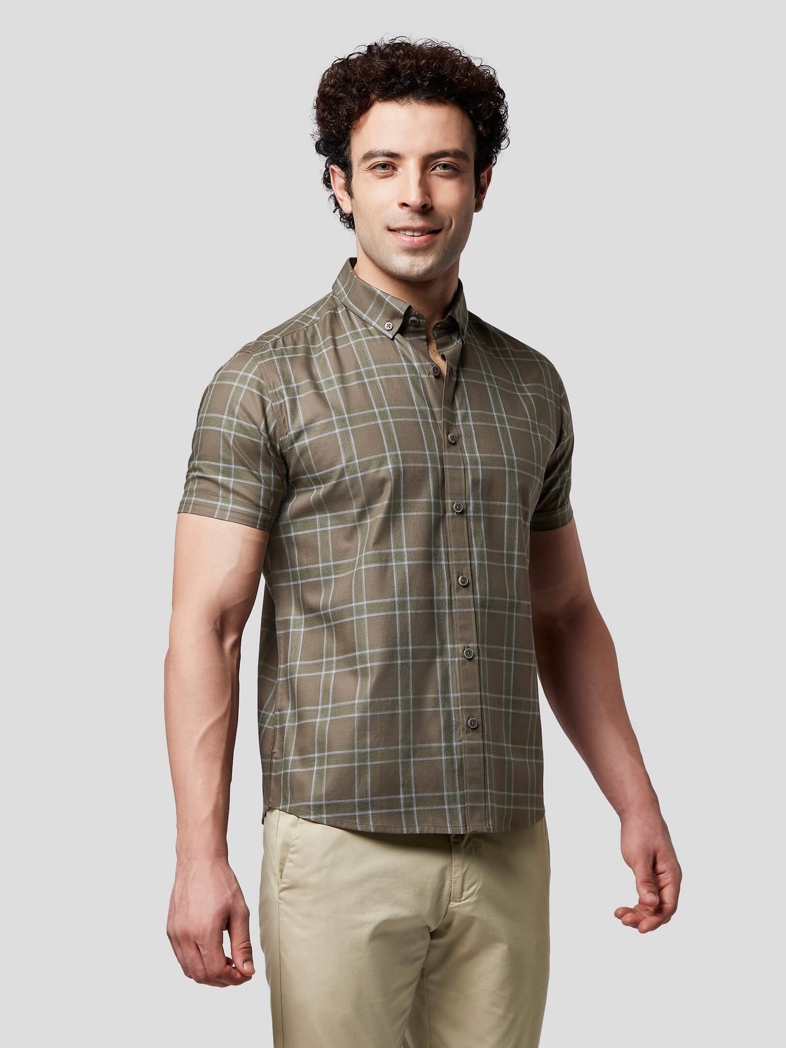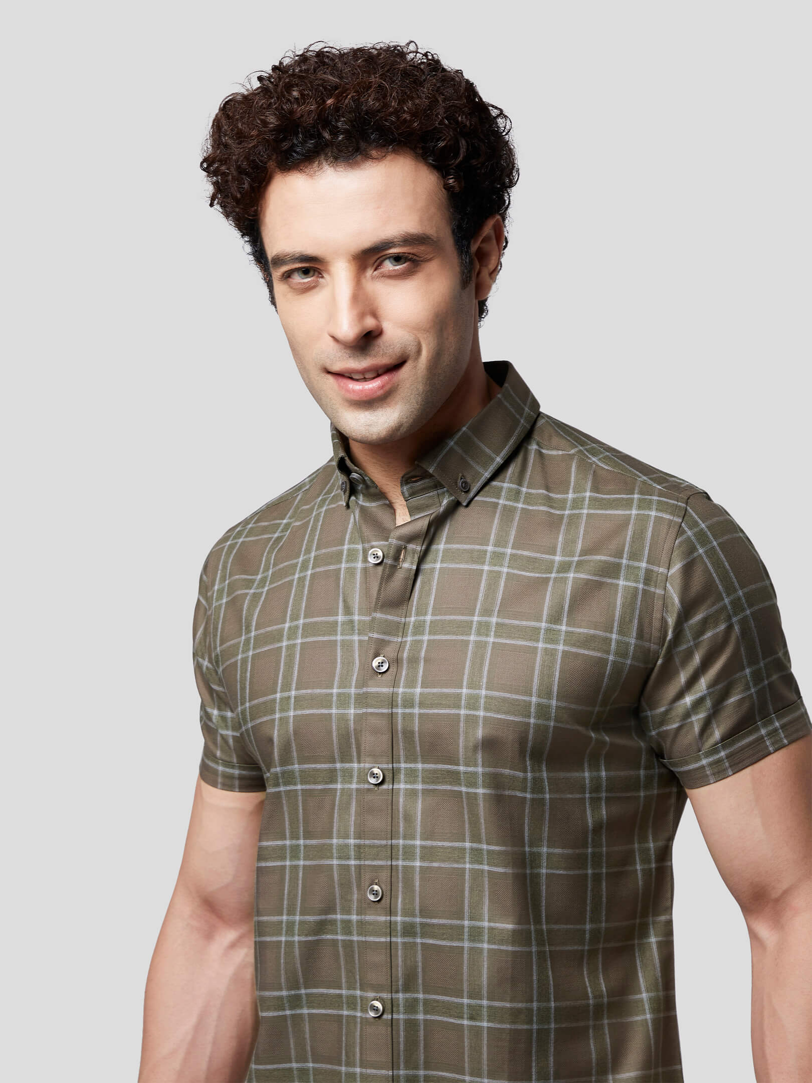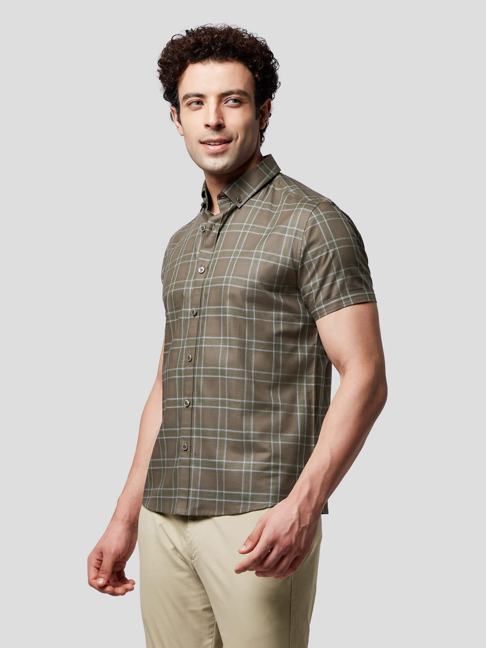 Expedience : Fulfill your desire of a comely look in Expedience Intricate Weave pattern Check shirt designed in natural cotton fabric featuring fabric elements of mélange yarn, twill weave and basket weave. With mesmerizing weave effects this shirt is crafted with soft collar, American placket, short turned-up sleeve, imitation of MOP shell buttons with lighter color rim. The craftsmanship of precision offers perfect pattern matching and an ultimate experience of comfort and ease.