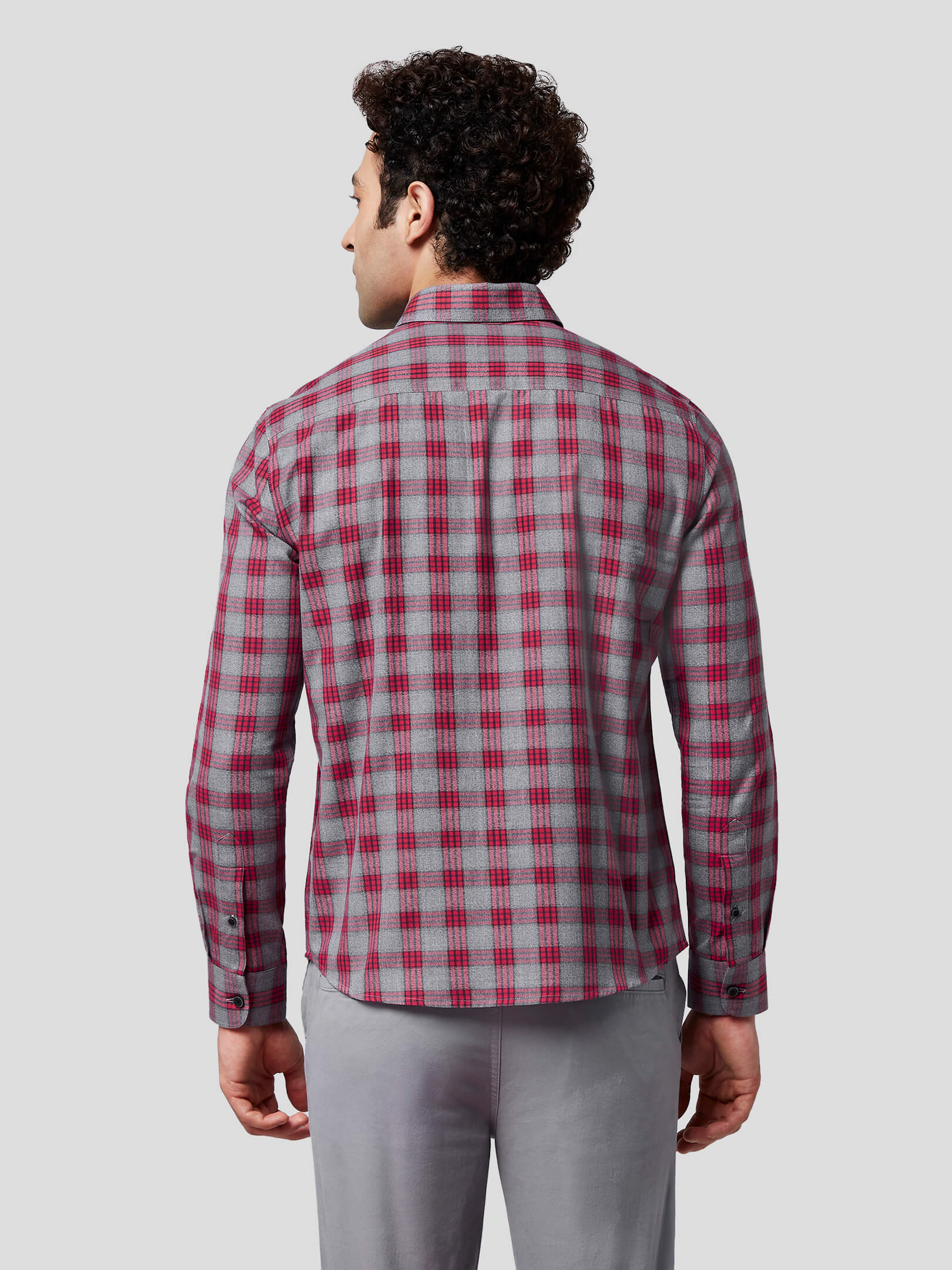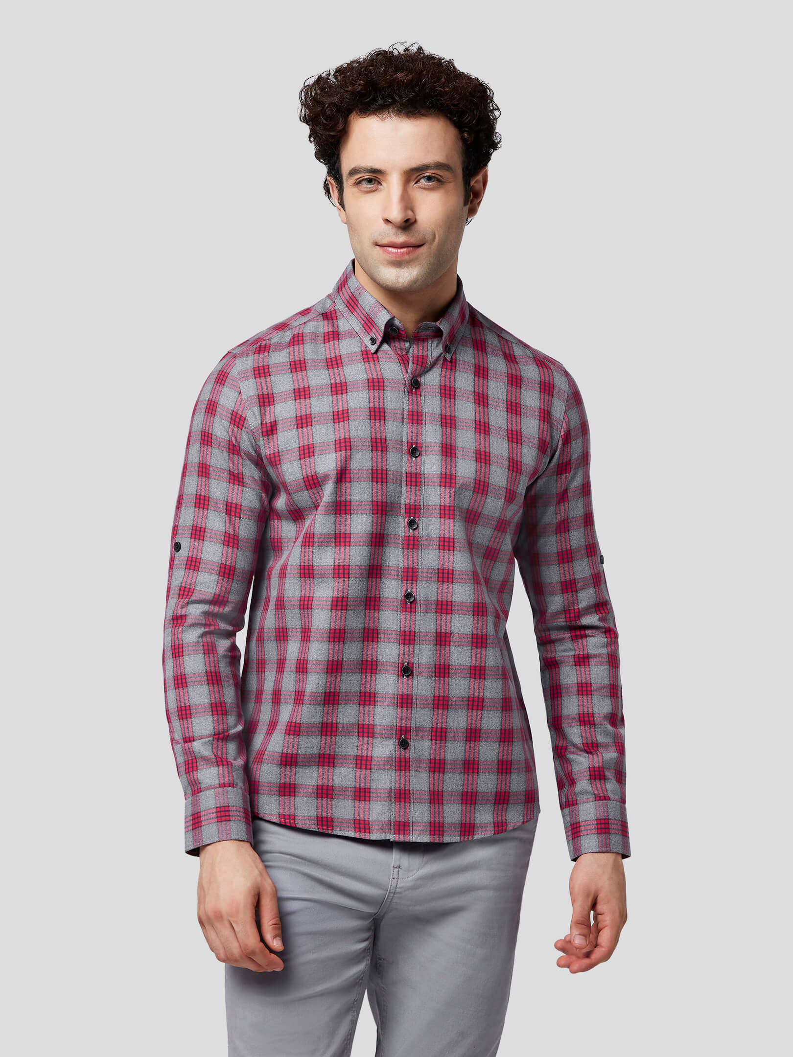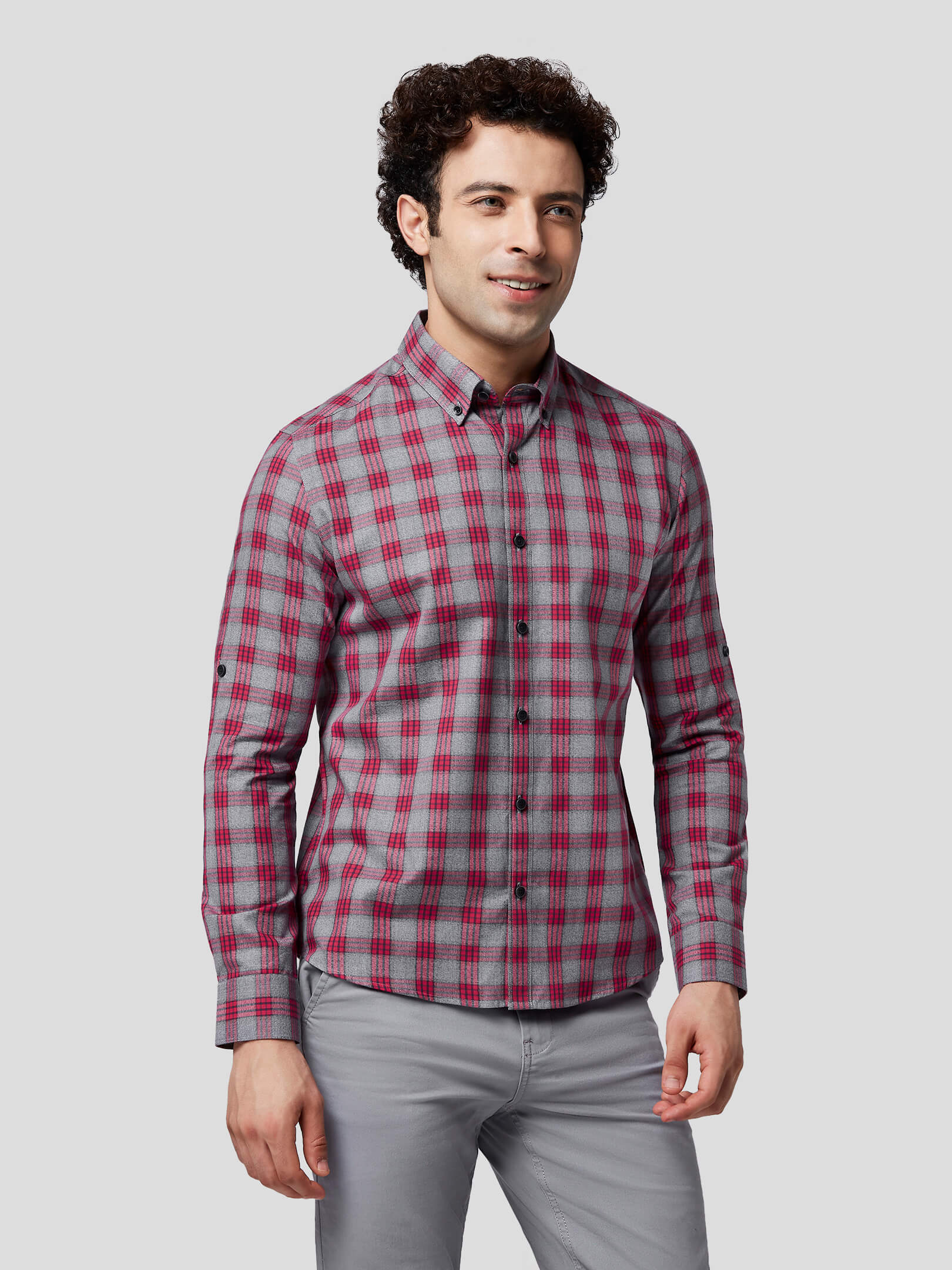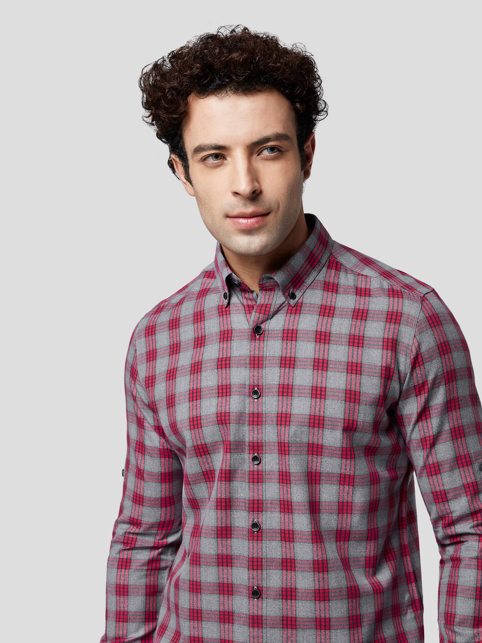 Nostalgia : Emotions are a mix of raw and multichromatic feelings, so is this natural mélange fabric which transforms your nostalgic feelings into grey & red check shirt. Add to your style quotient an untuck fit shirt designed with contrast buttons, American placket, button down collar and single button round cuffs. Let the onlookers decode your casually formal attitude and buzzing emotions.