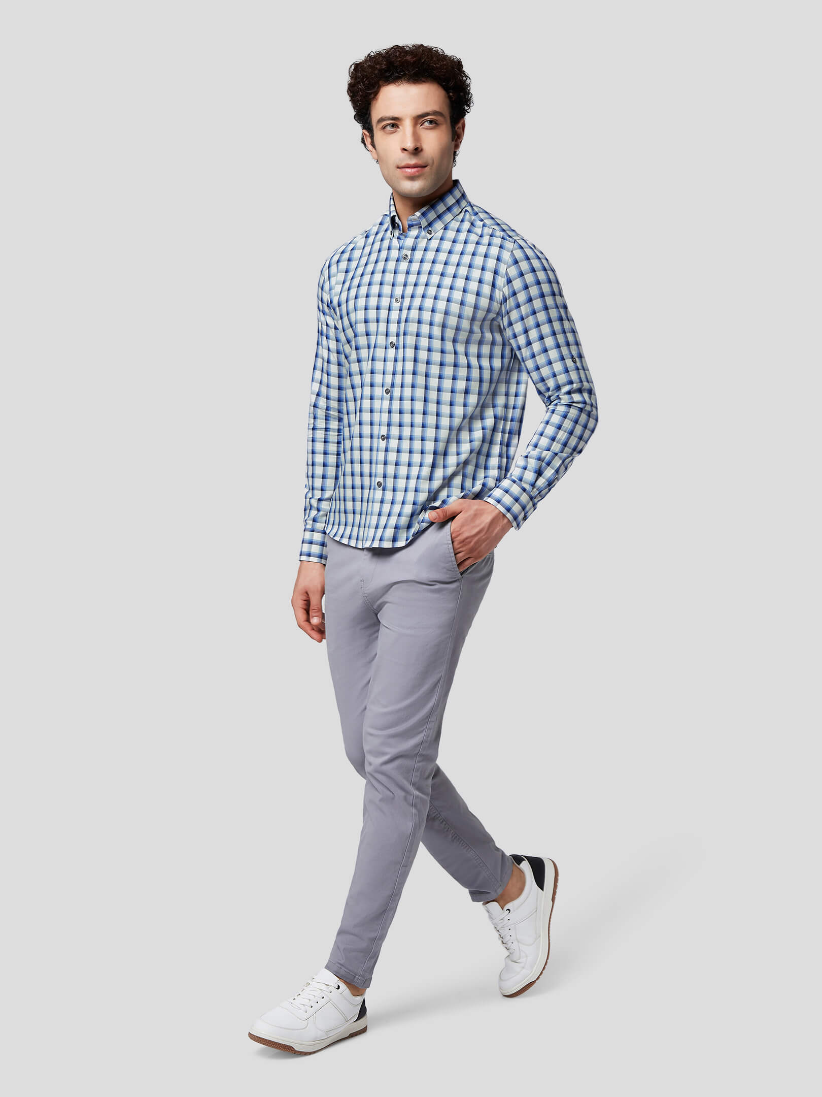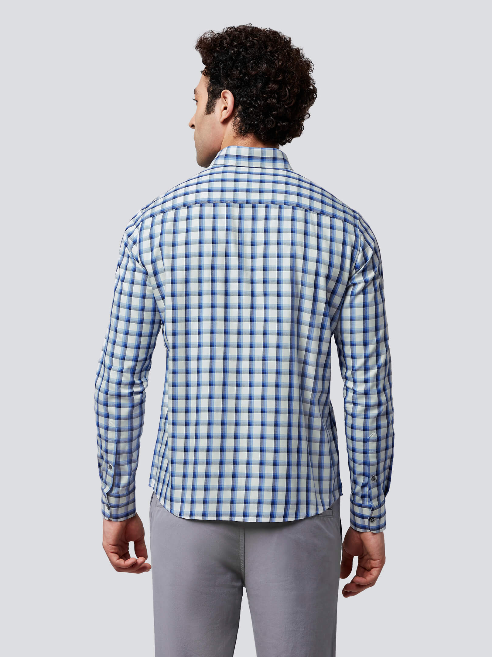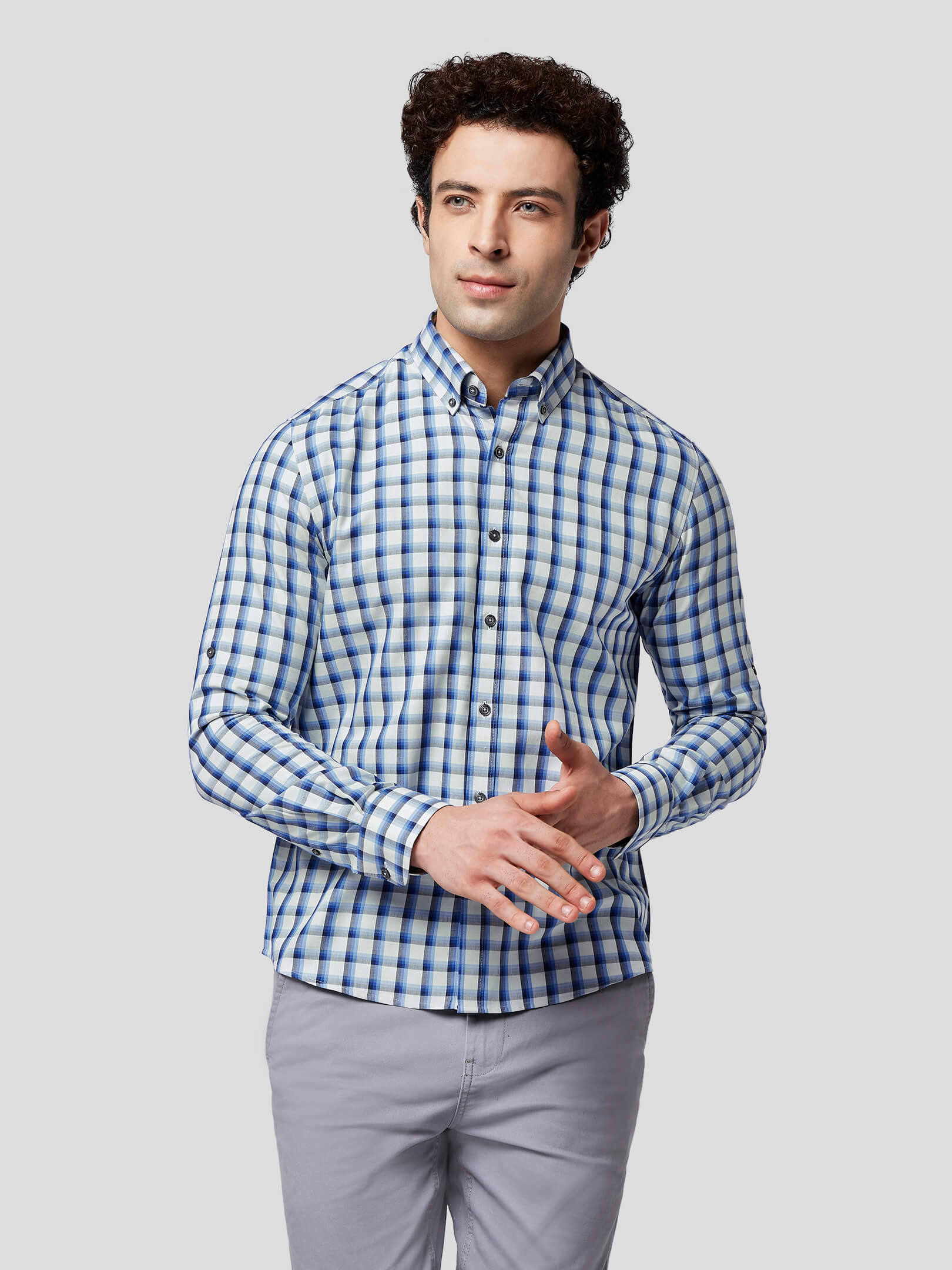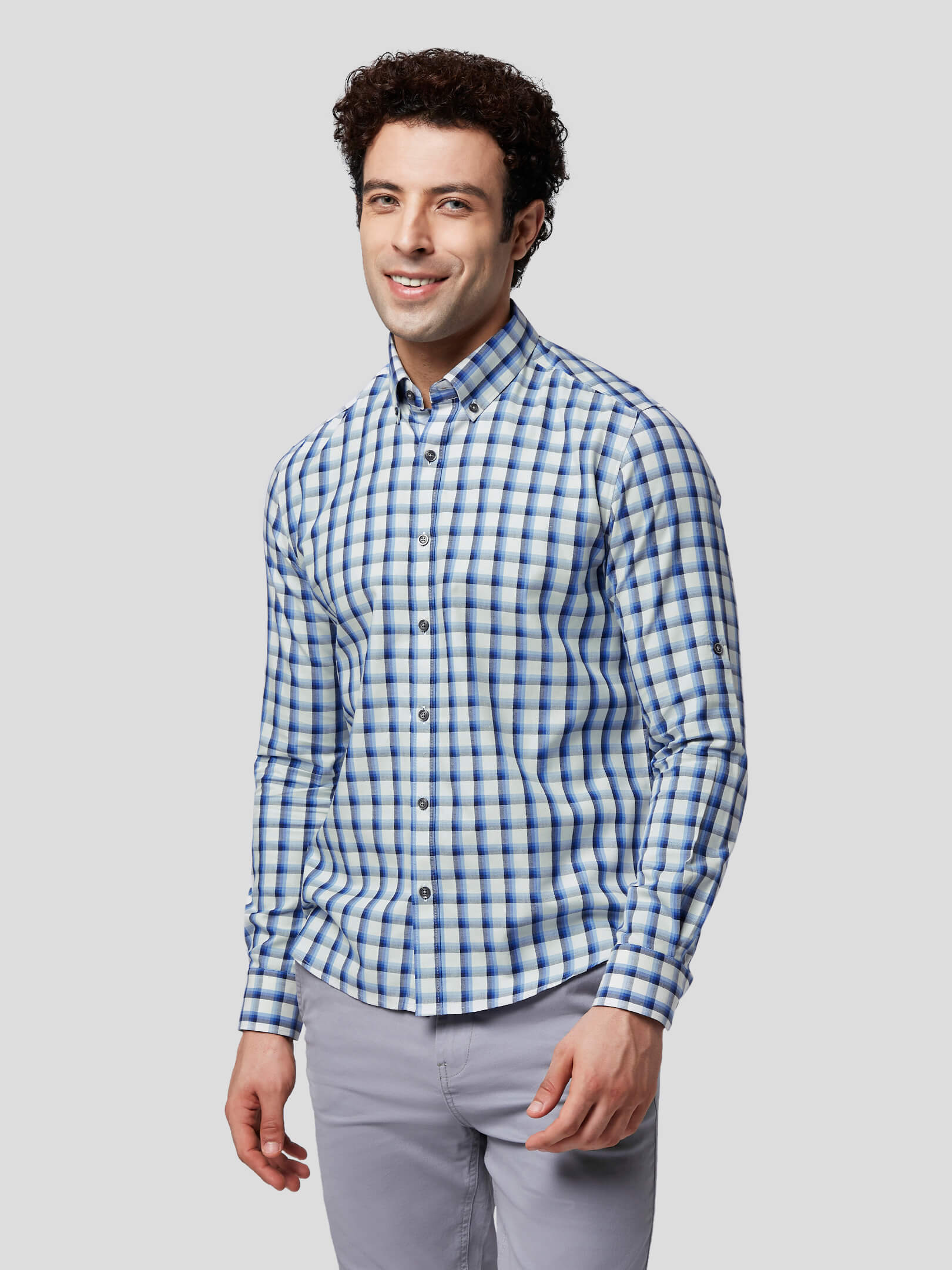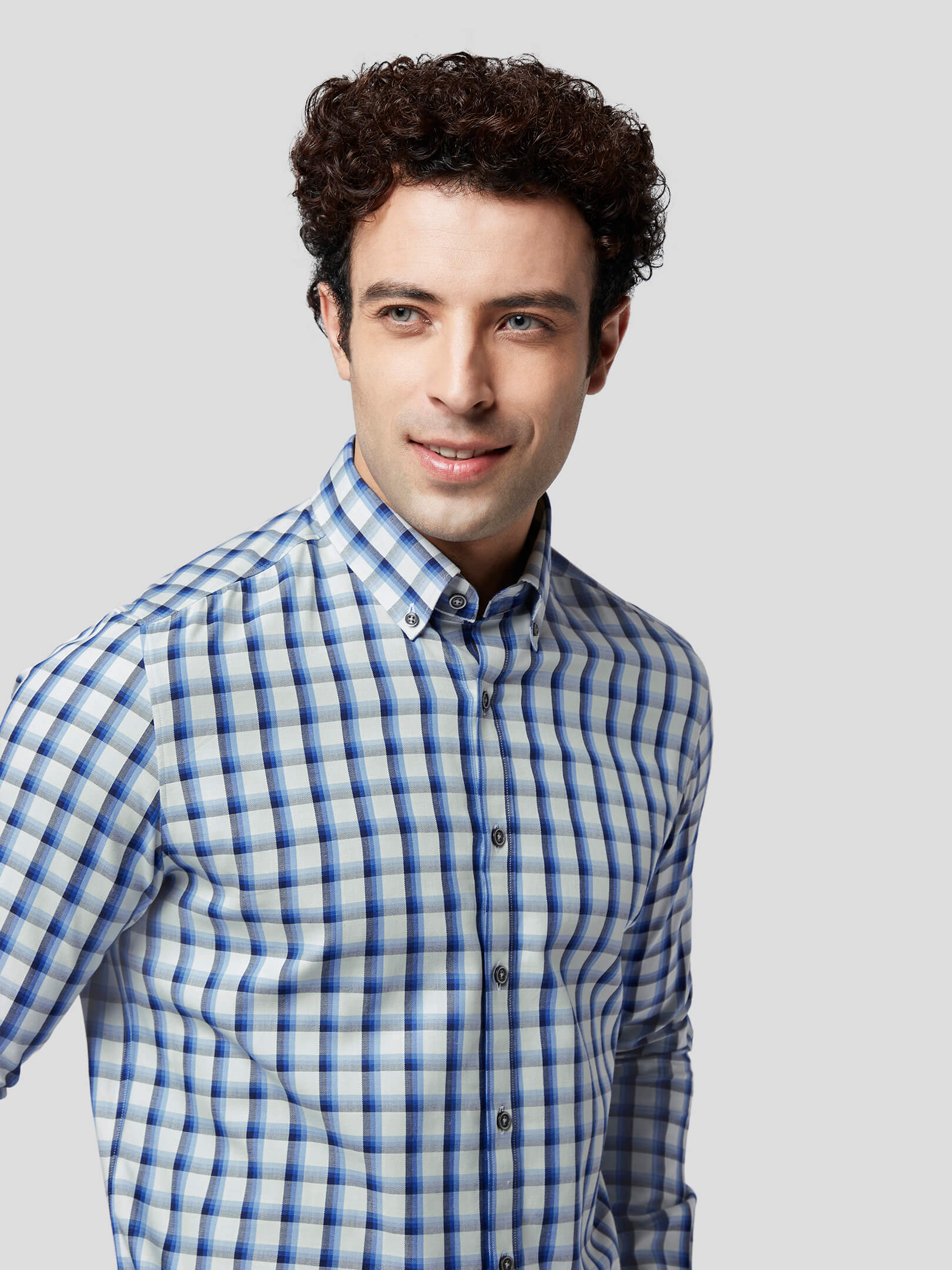 Brio Gradient : Your leadership talks about the strength of body and agility of mind which gets further underlined when you wear a Brio Gradient Blue Check shirt made with finest natural cotton twill fabric. Crafted responsibly with American Placket, rolled up sleeves and single button cuff this shirt comes with soft collar and cuffs, where untuck fit style gives you a casually formal look in a perfectly matched check pattern.