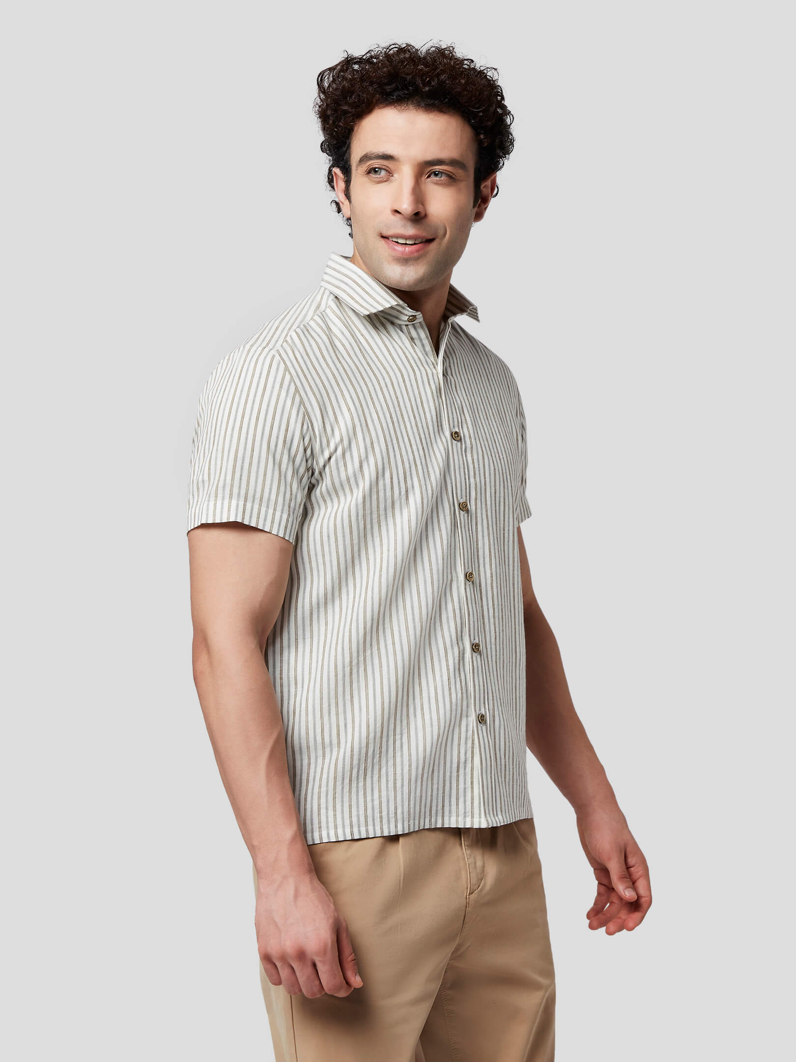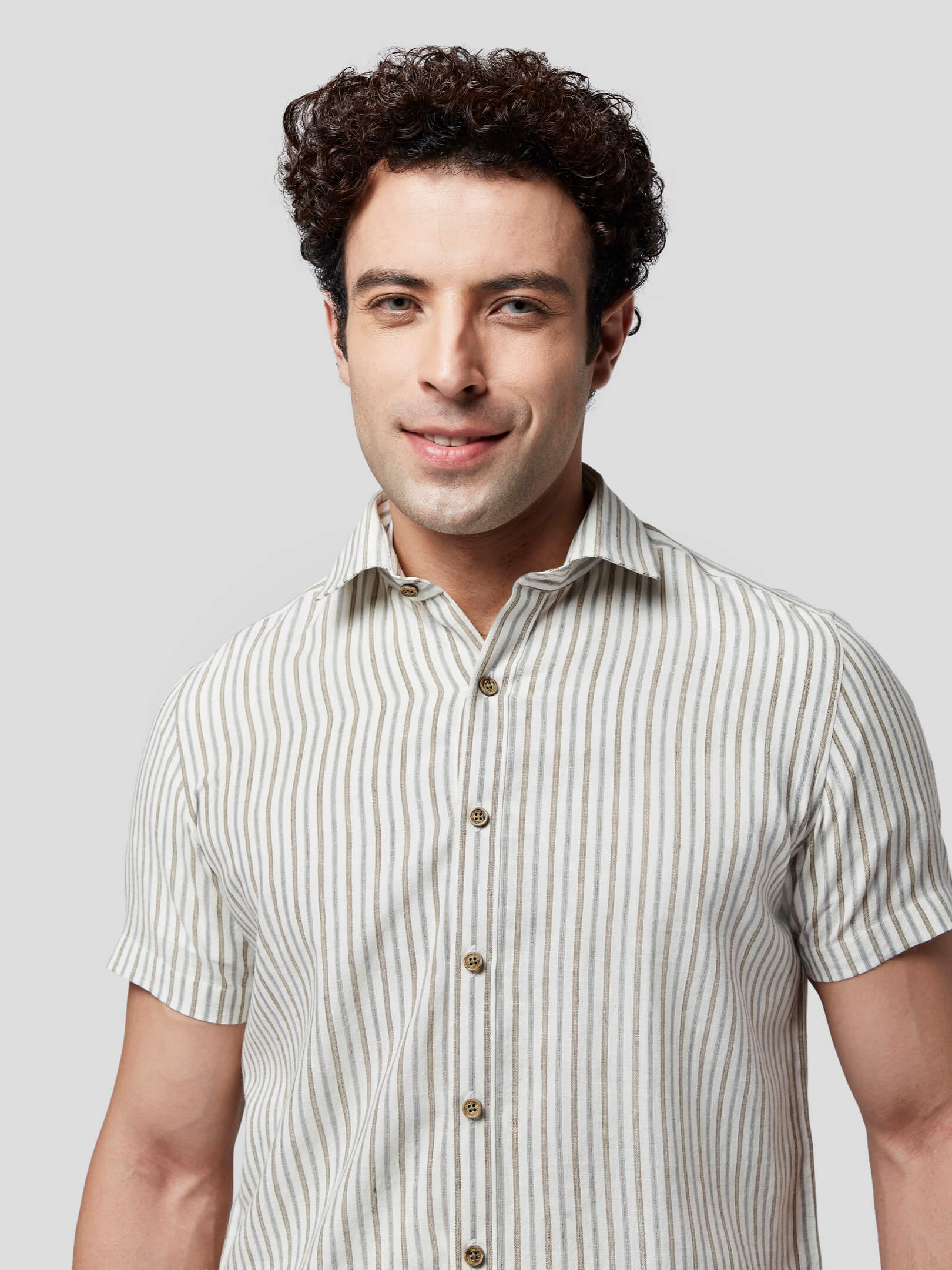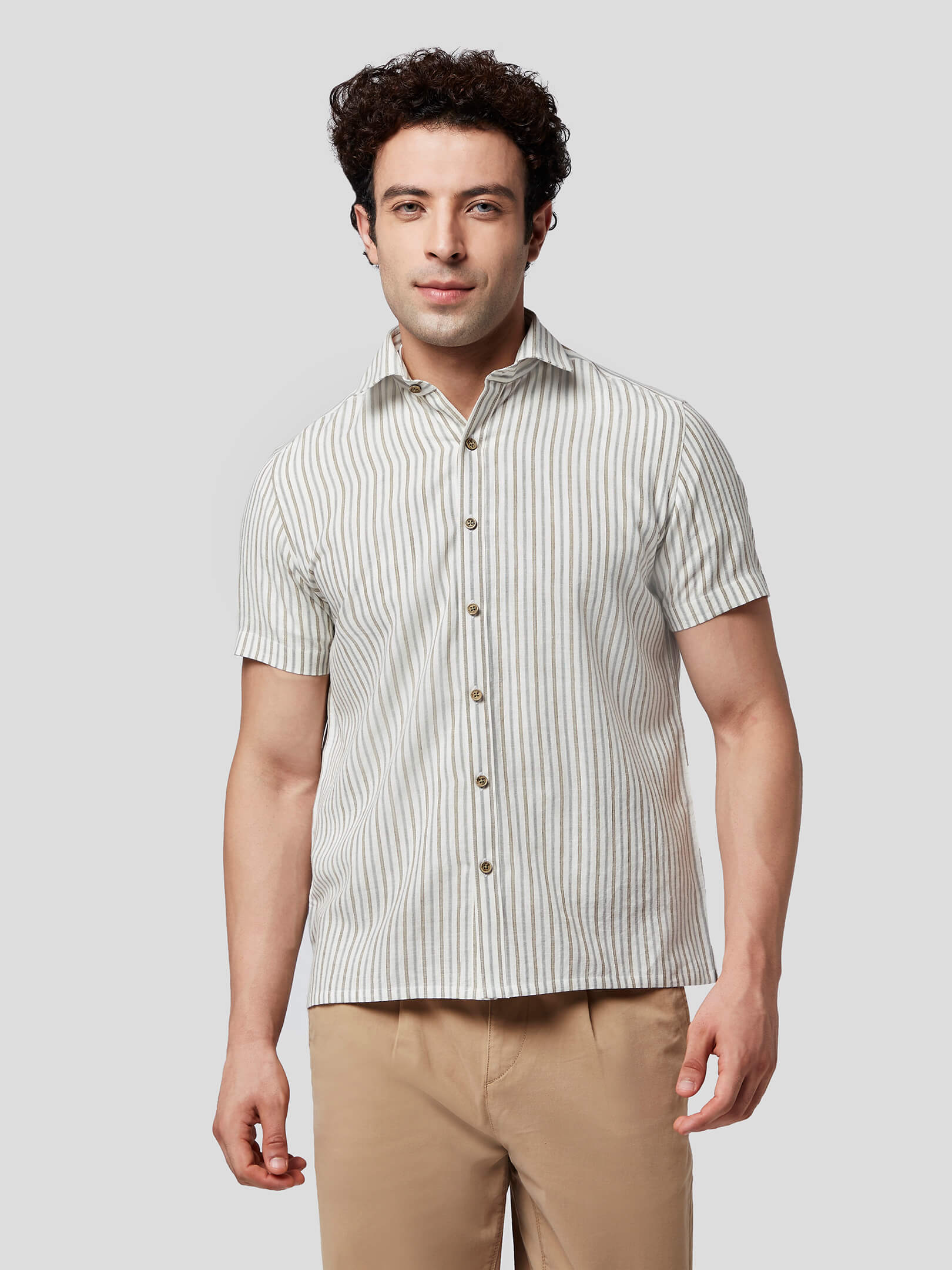 Escape : Get rid of irresponsible reactions and choose an Escape Khadi Stripe shirt to underline your responsible leader-like personality with a breezy effect . Designed in handloom fabric with environmentally friendly imported recycled polyester buttons. This spread collar short sleeve shirt has American placket, straight bottom and precisely matched bottom and side slit to give you a comfortable breathy feel. It is an opportunity dress casual on a business day.