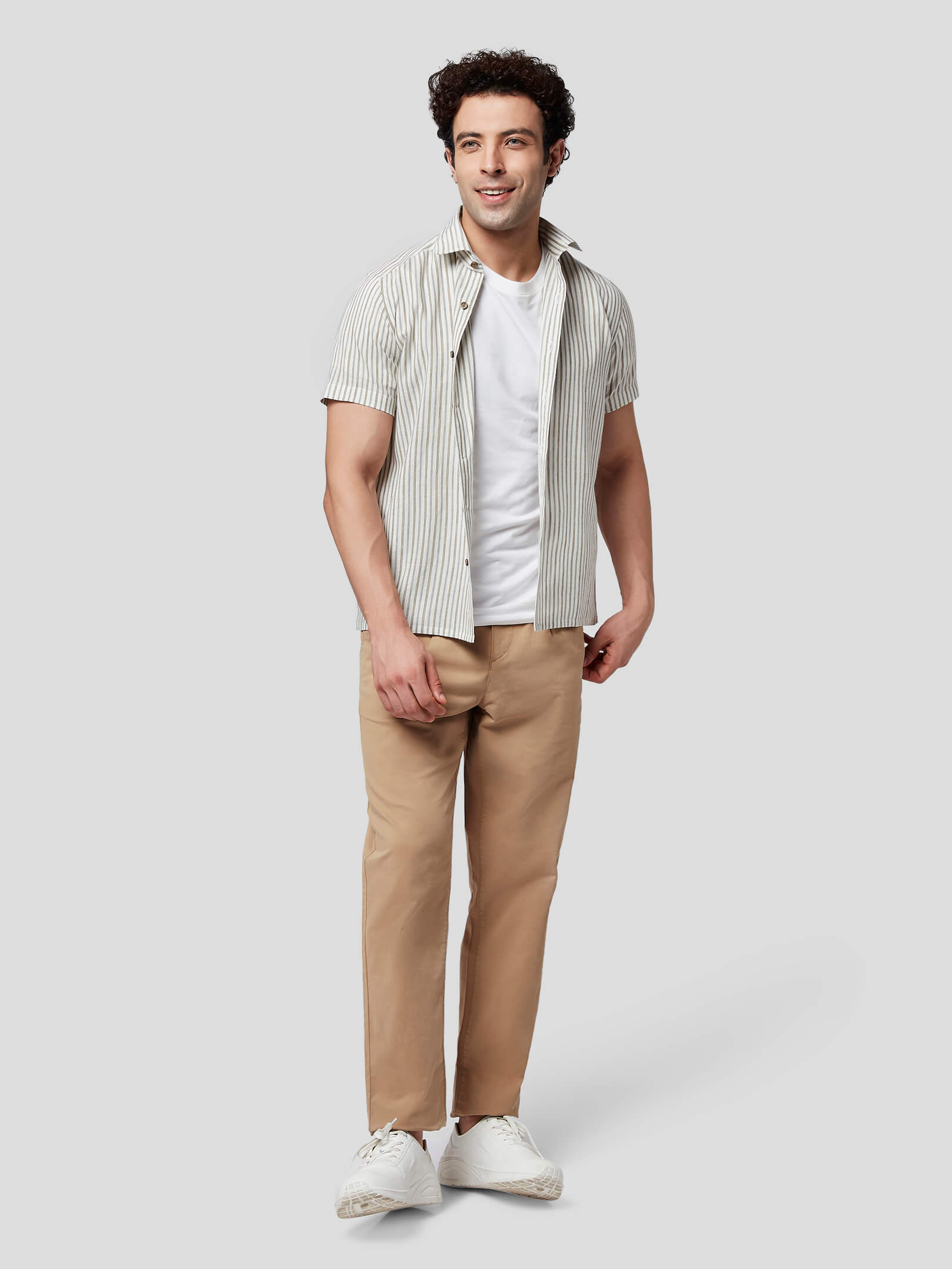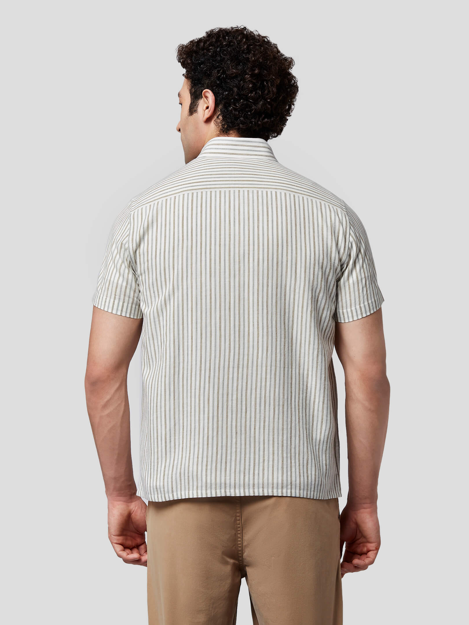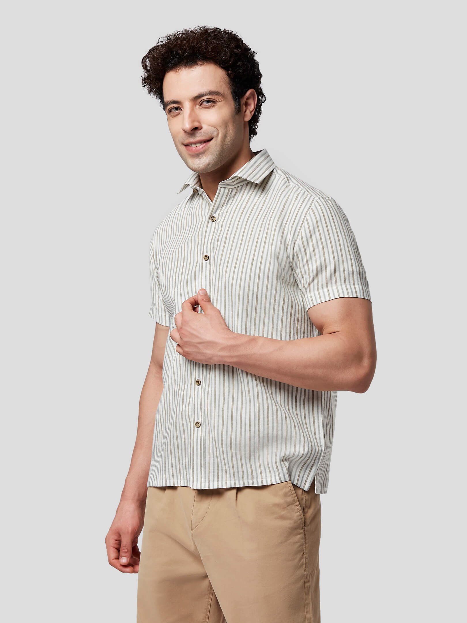 Escape : Get rid of irresponsible reactions and choose an Escape Khadi Stripe shirt to underline your responsible leader-like personality with a breezy effect . Designed in handloom fabric with environmentally friendly imported recycled polyester buttons. This spread collar short sleeve shirt has American placket, straight bottom and precisely matched bottom and side slit to give you a comfortable breathy feel. It is an opportunity dress casual on a business day.