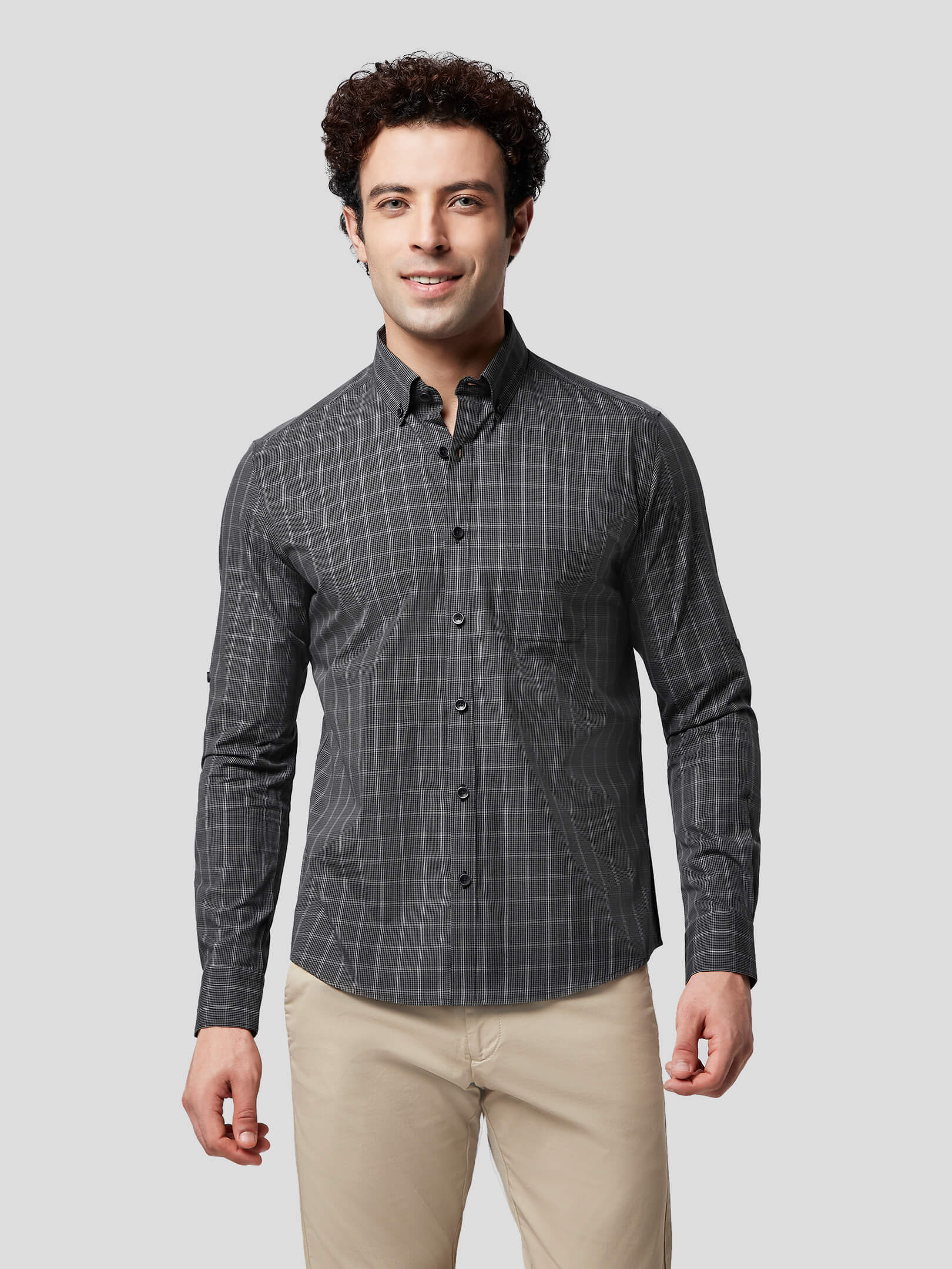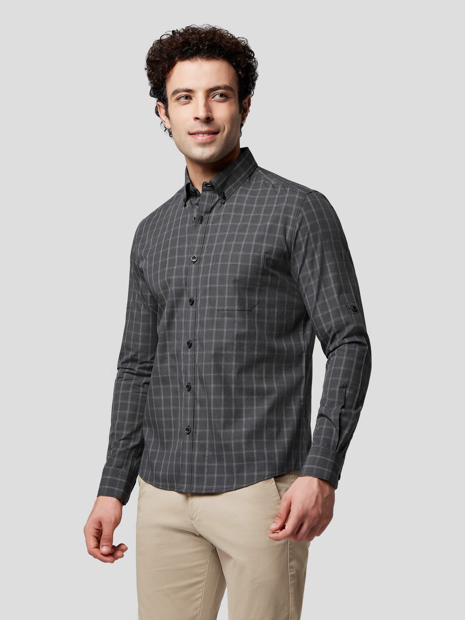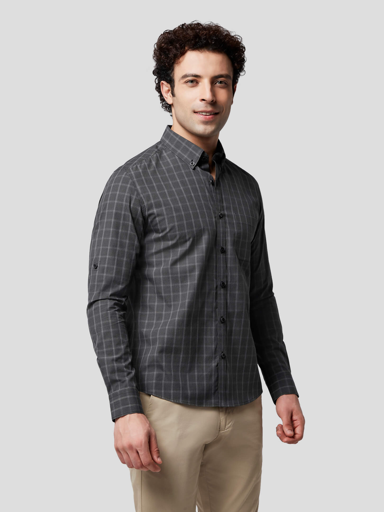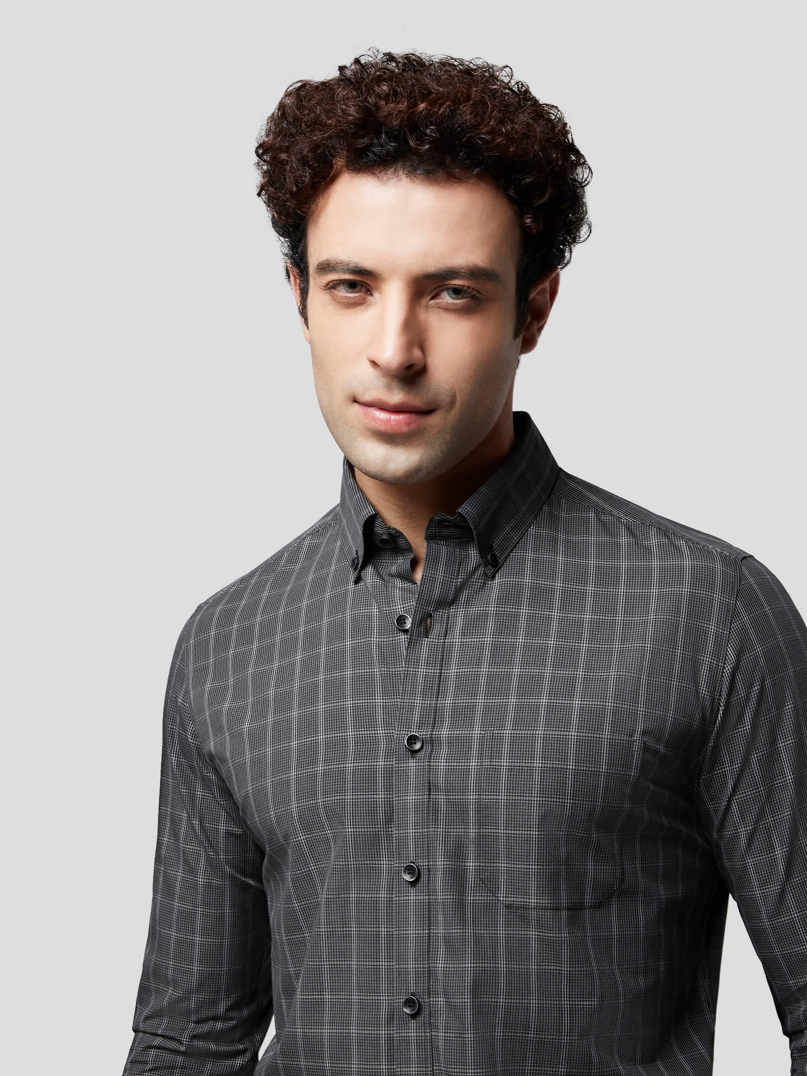 Aureole : Allow your personality to glow and emit radiance of a leader in Aureole Achromatic Check Shirt, made with 50s natural cotton fabric with grey, black and white color checks creating a charcoal hue. Designed with soft and comfortable button-down collar and softer single button round cuffs, American placket, single patch pocket and the freedom to wear in rolled-up sleeves, this shirt adds radiance to your personality. With precise pattern matching and feel-good stitching this shirt has been crafted for an ultra premium feel and cool attitude supported in untuck fit style.