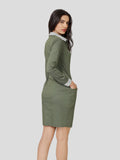 Svelte Stretch Cotton Shirt Dress: Let your slender elegance be captured naturally in our stretch cotton shirt dress designed with stripe printed cuff and collar, white buttons stitched with green thread. Stretchable cotton elegantly enhances the body contour and princess seam turns stylishly into pockets to give a glamorous sheen to your look. So be ready to look responsibly fashionized in a Svelte look.