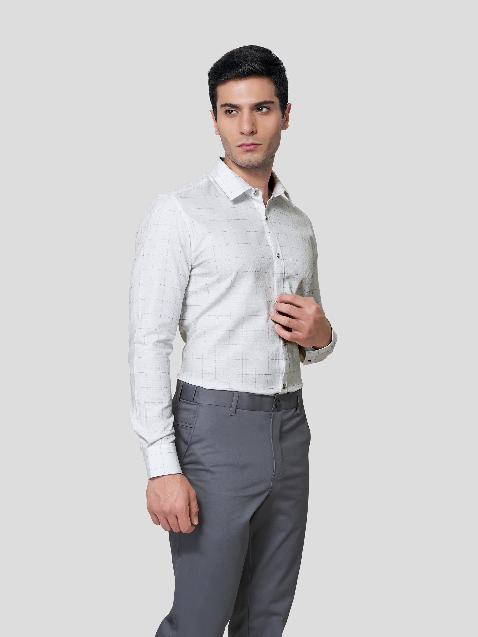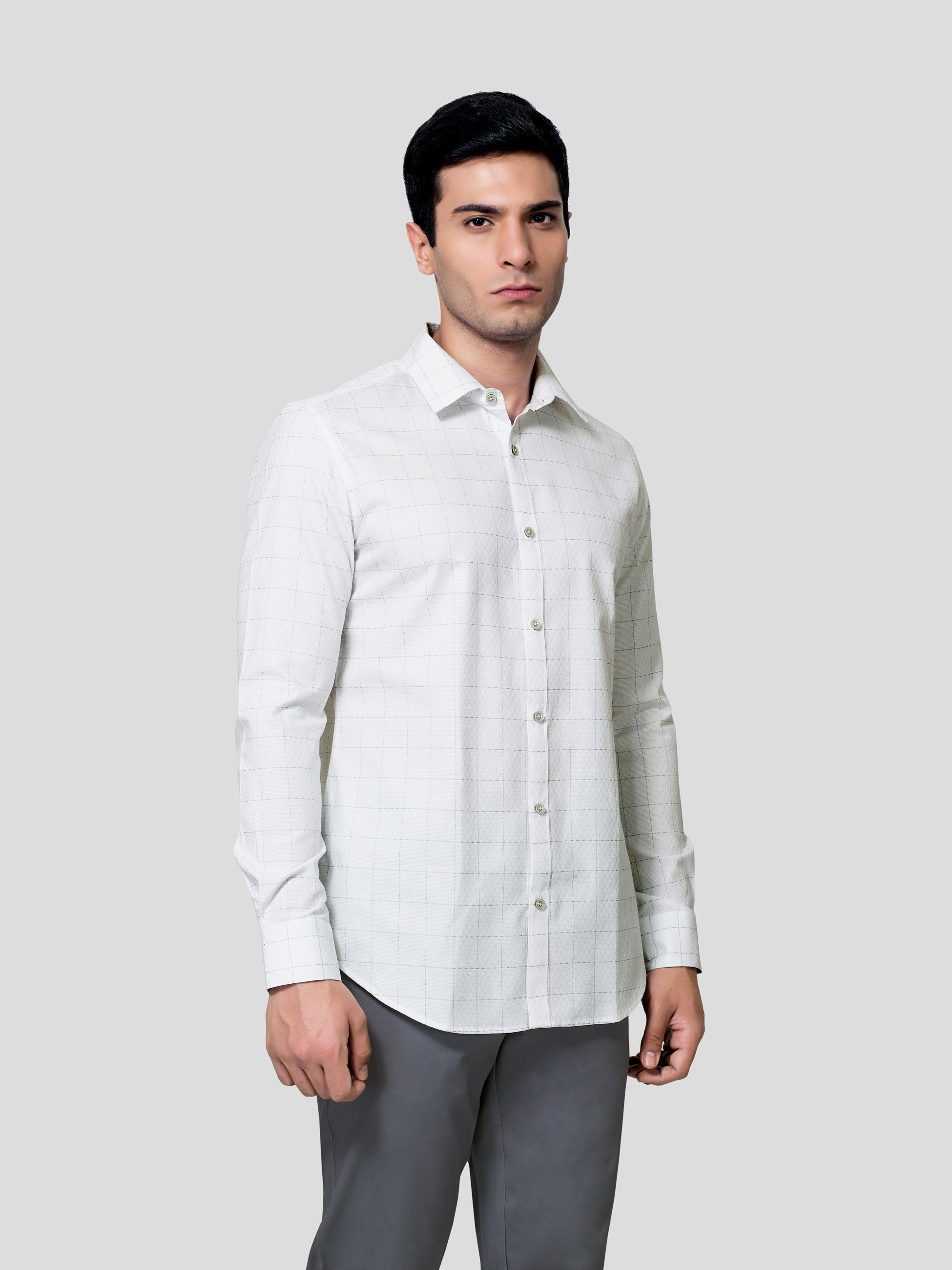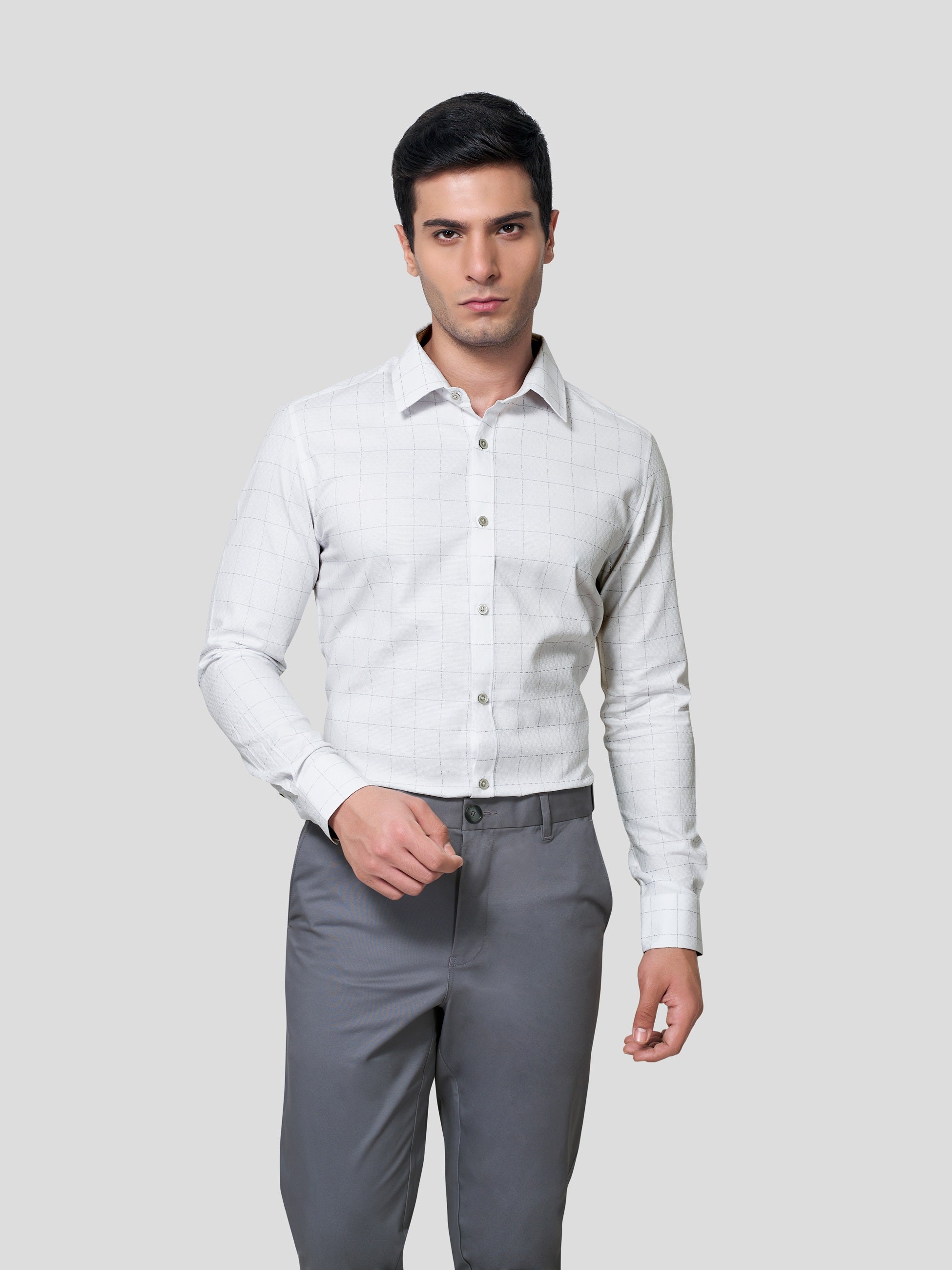 Enhance your majestic personality in Baronial Subtle Dobby Check shirt, designed responsibly for a glorious business formal look. Crafted in point collar with American placket, back shoulder on bias, round cuff with adjustable buttons and contrast button detailing. Experience nature’s purity in 60s cotton fabric and feel responsibly fashionized