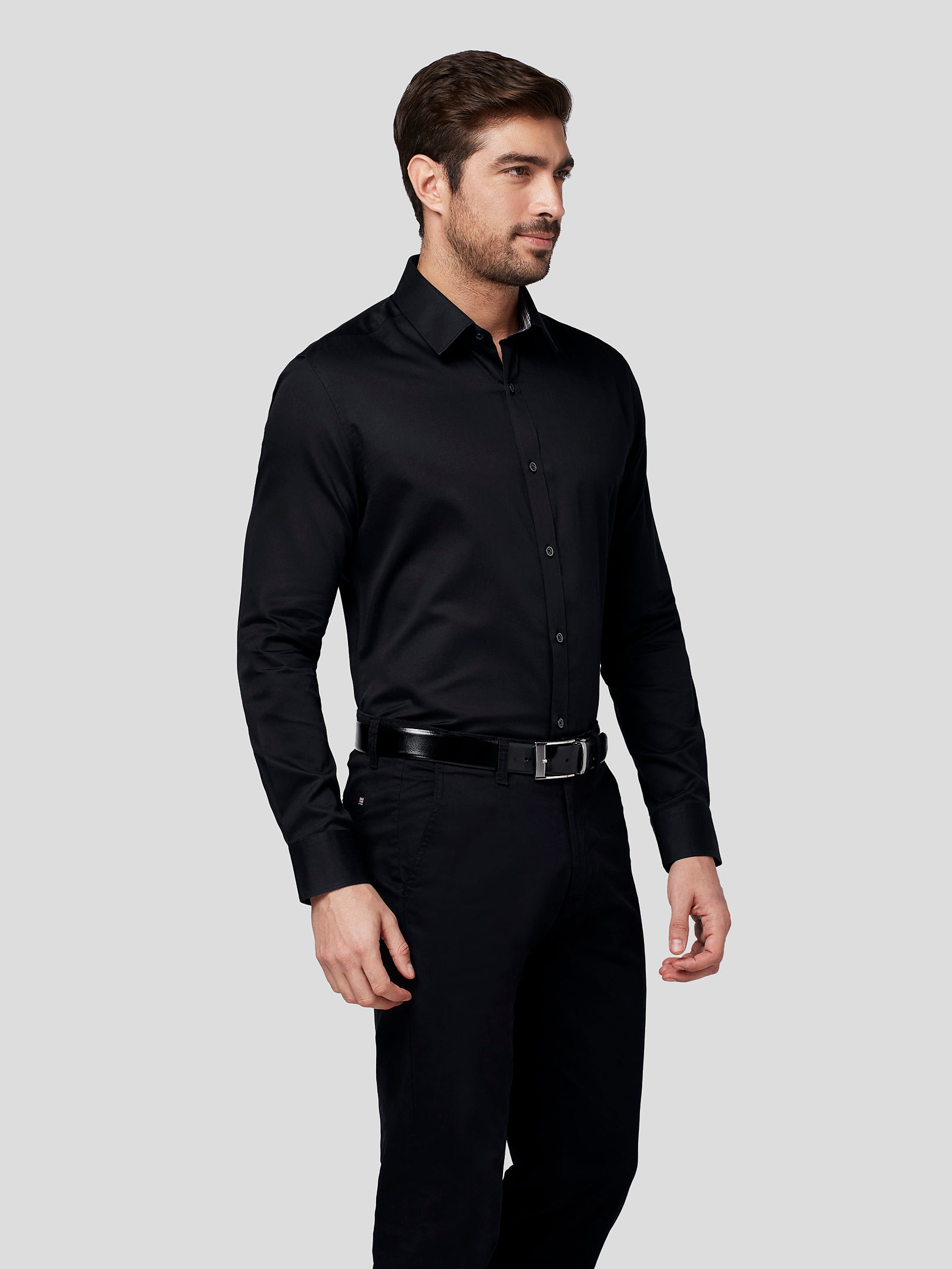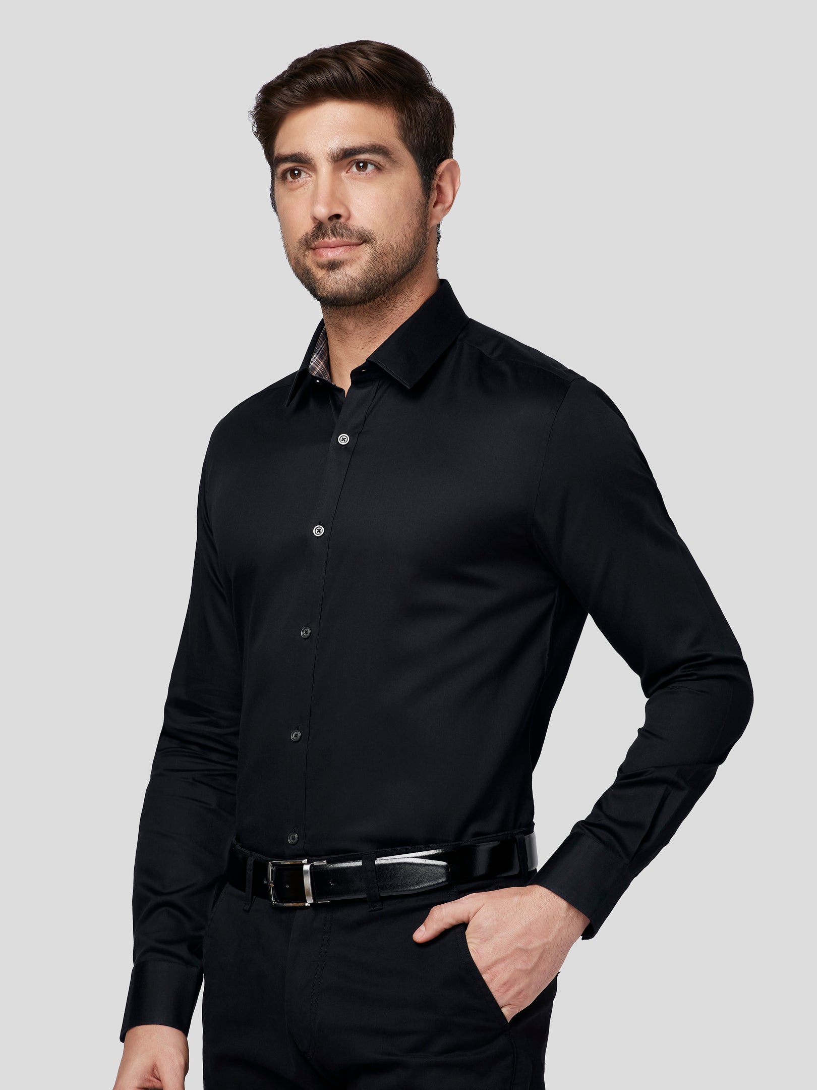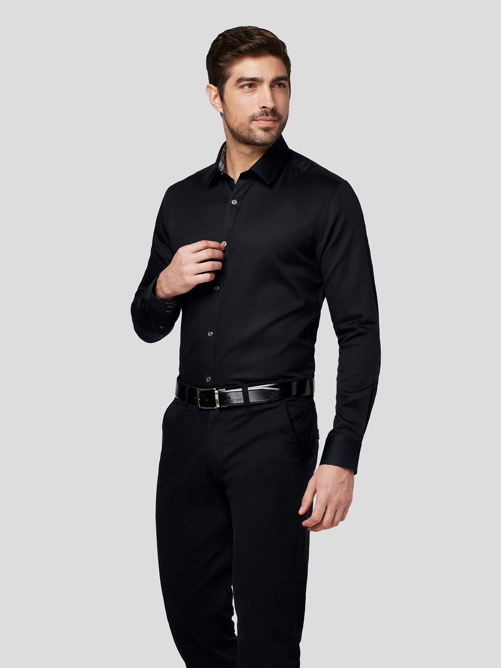 Bold and smart look for you in black color fabric with contrast trim detail at neck band. The pointed collar, American placket and square cuff are deigned to internationalize. The high quality MOP shell buttons set a perfect trend for you.