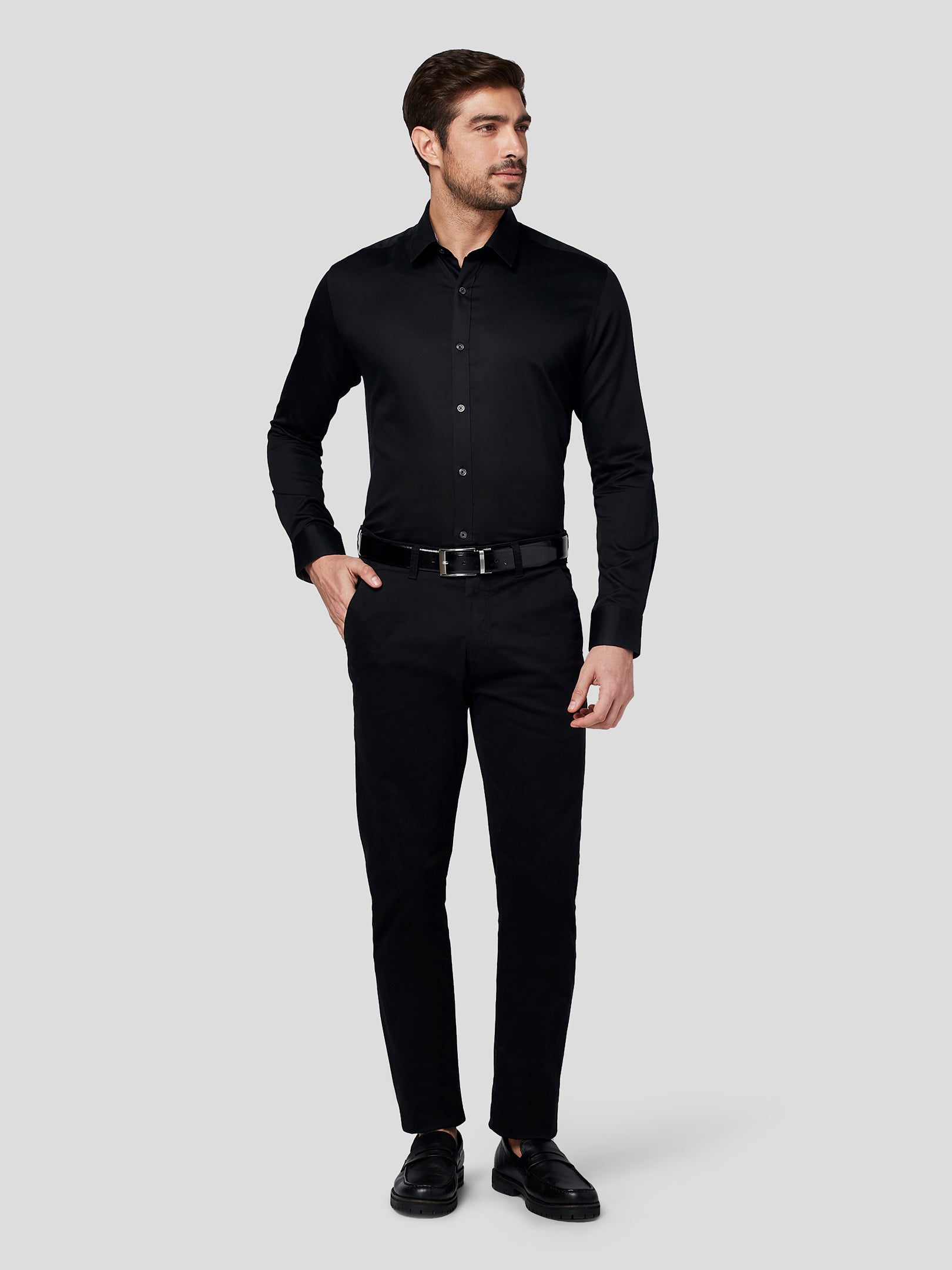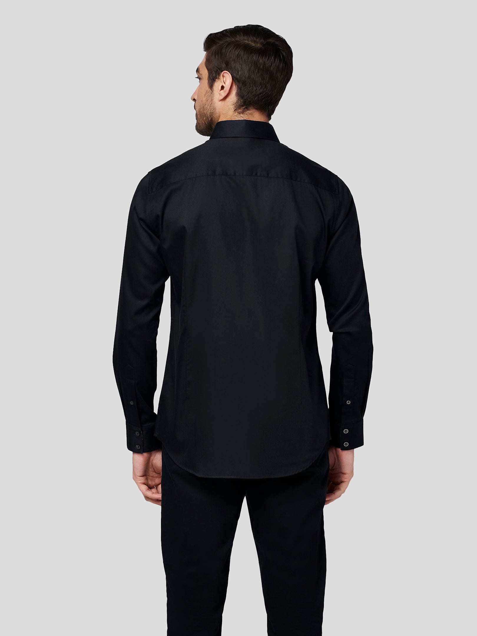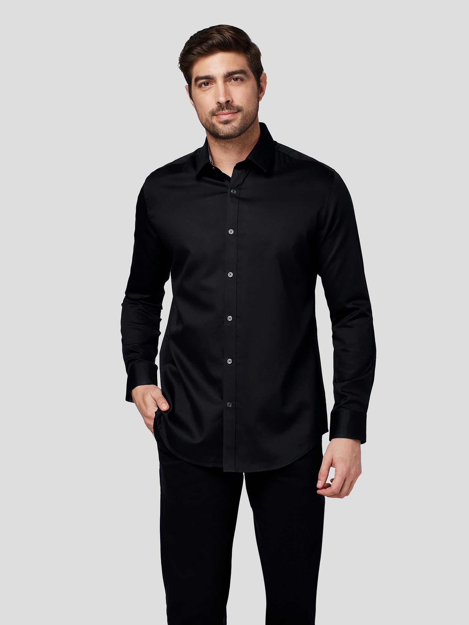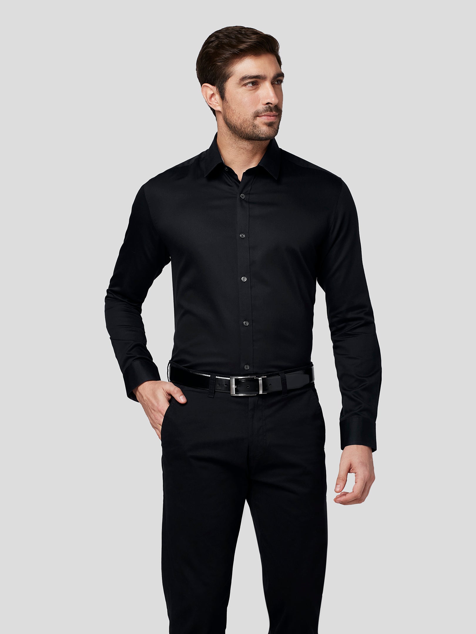 Bold and smart look for you in black color fabric with contrast trim detail at neck band. The pointed collar, American placket and square cuff are deigned to internationalize. The high quality MOP shell buttons set a perfect trend for you.