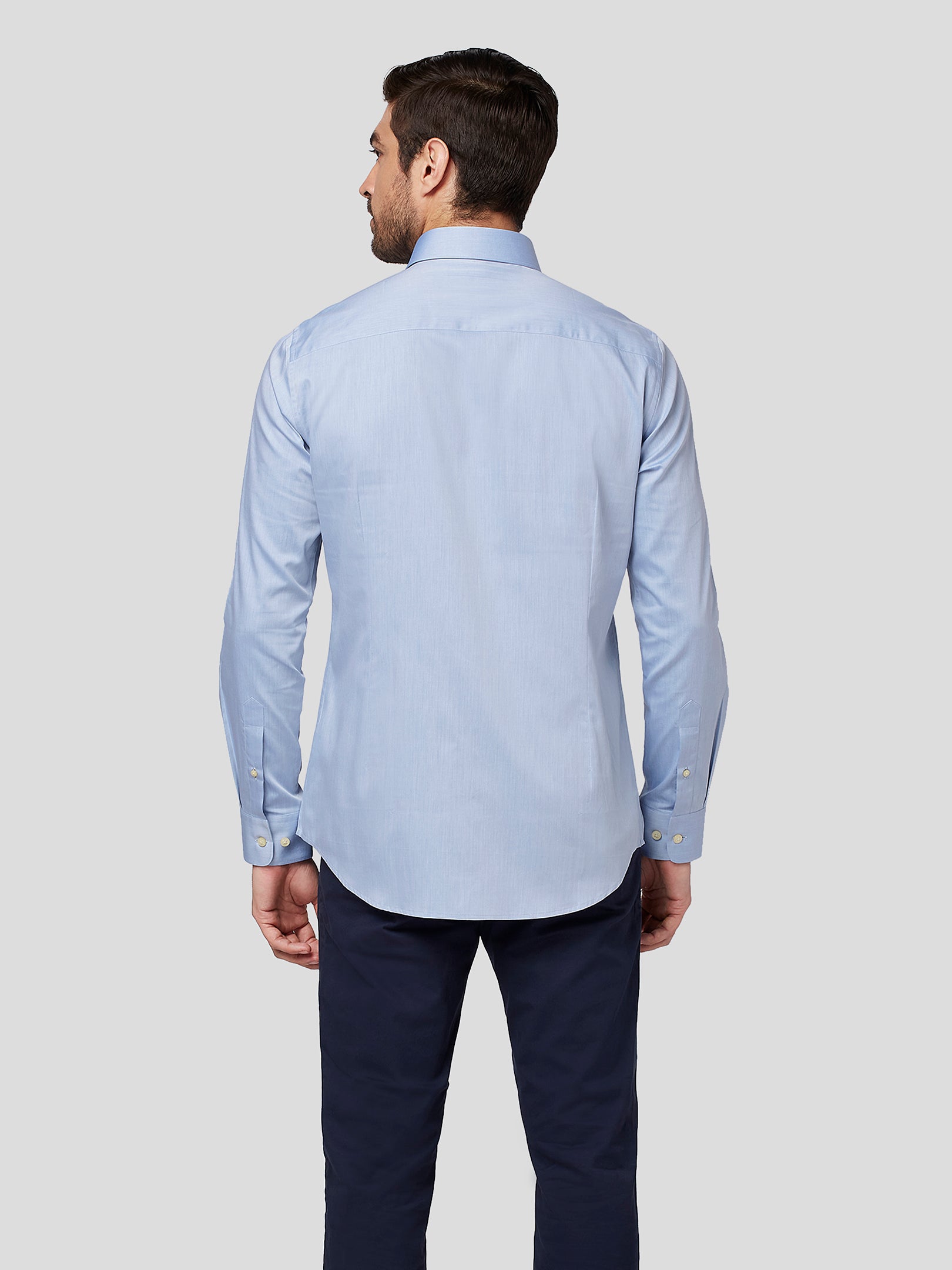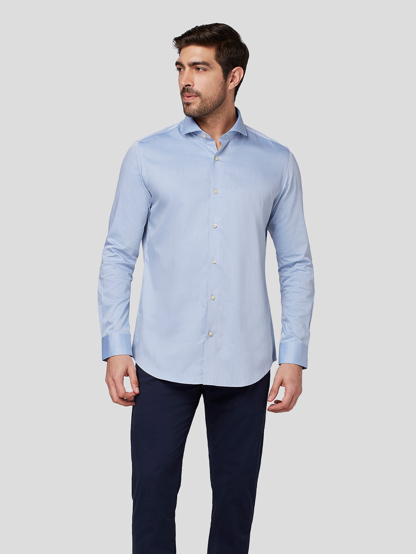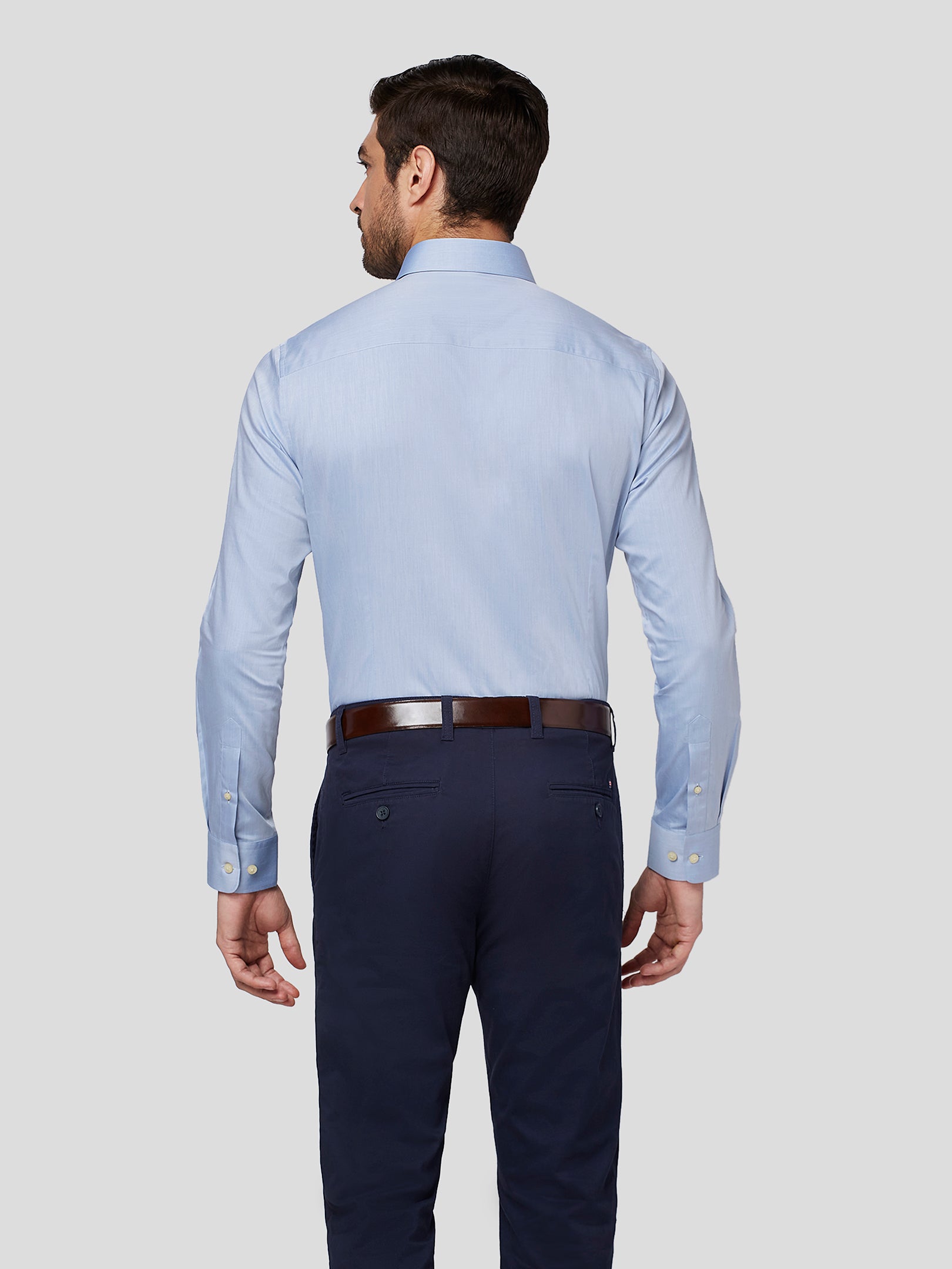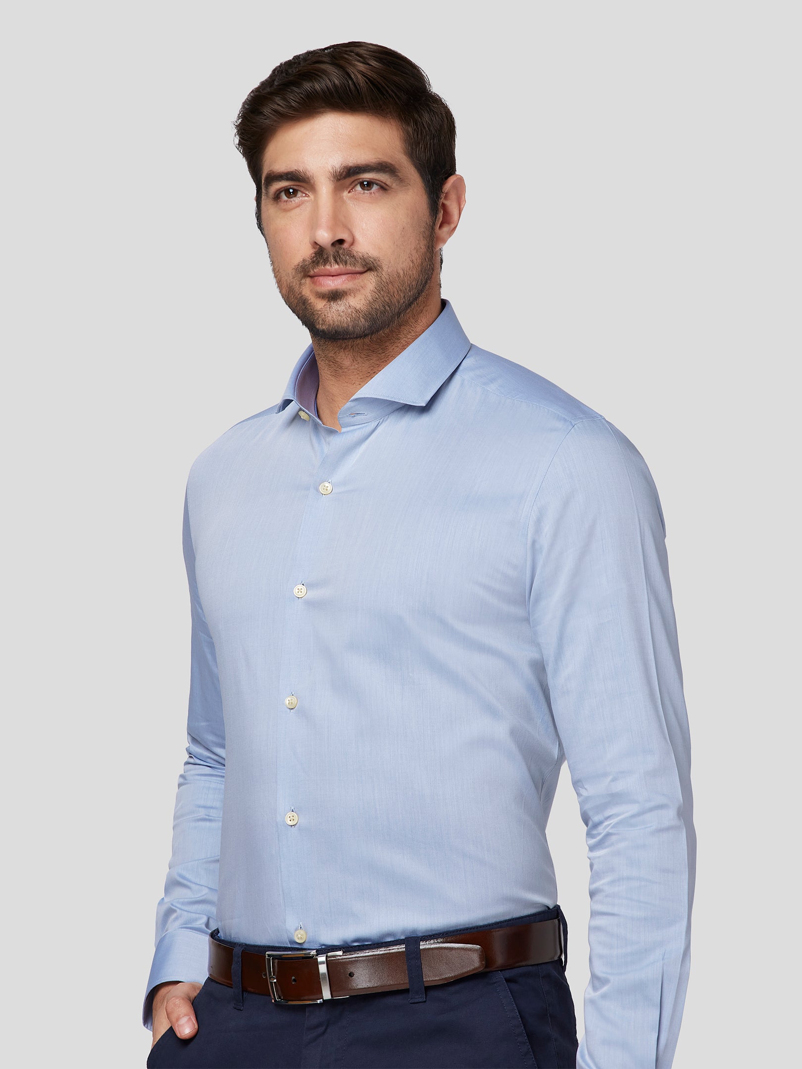 Enjoy the joy of a performer in cut way collar shirt, rounded cuff and french placket. White buttons are pear like decoration in the achiever's personality.