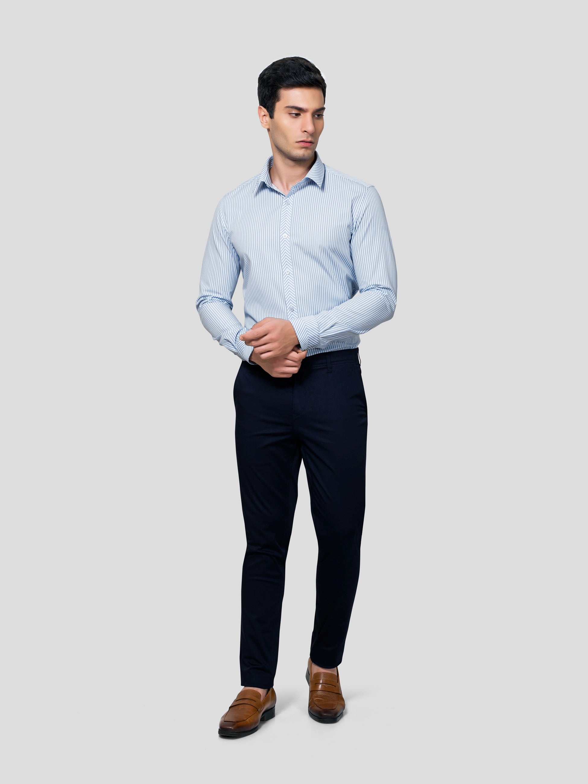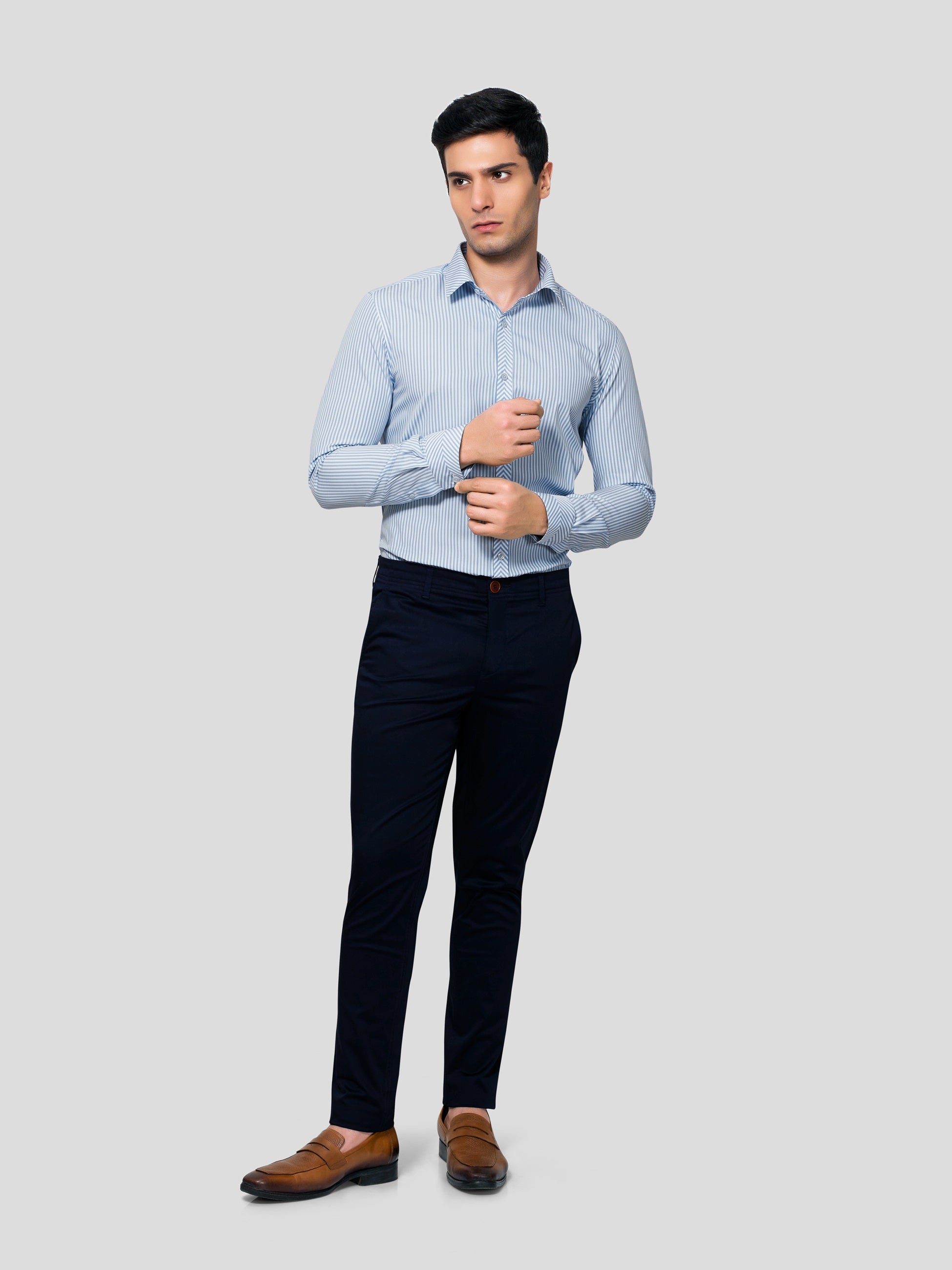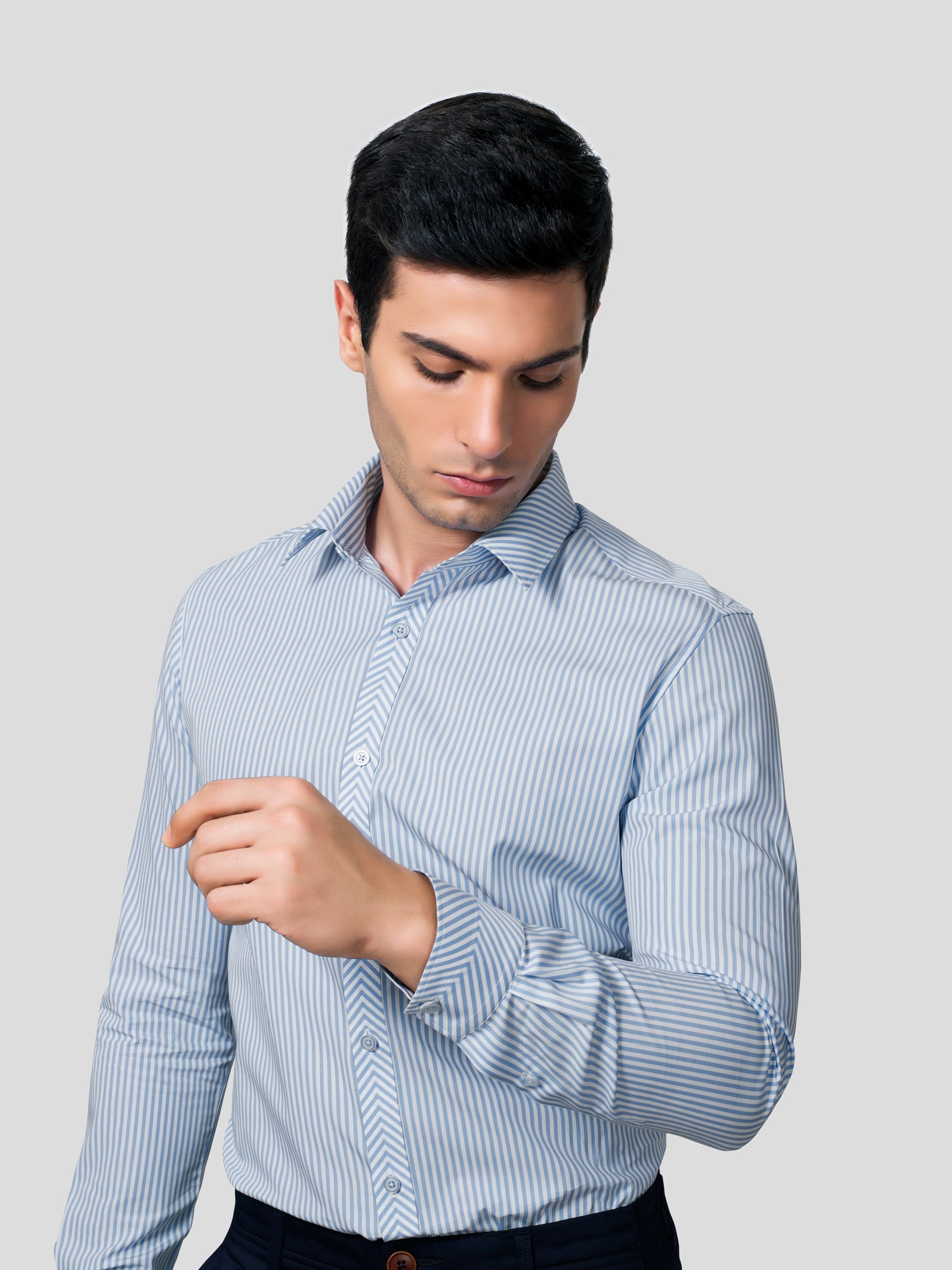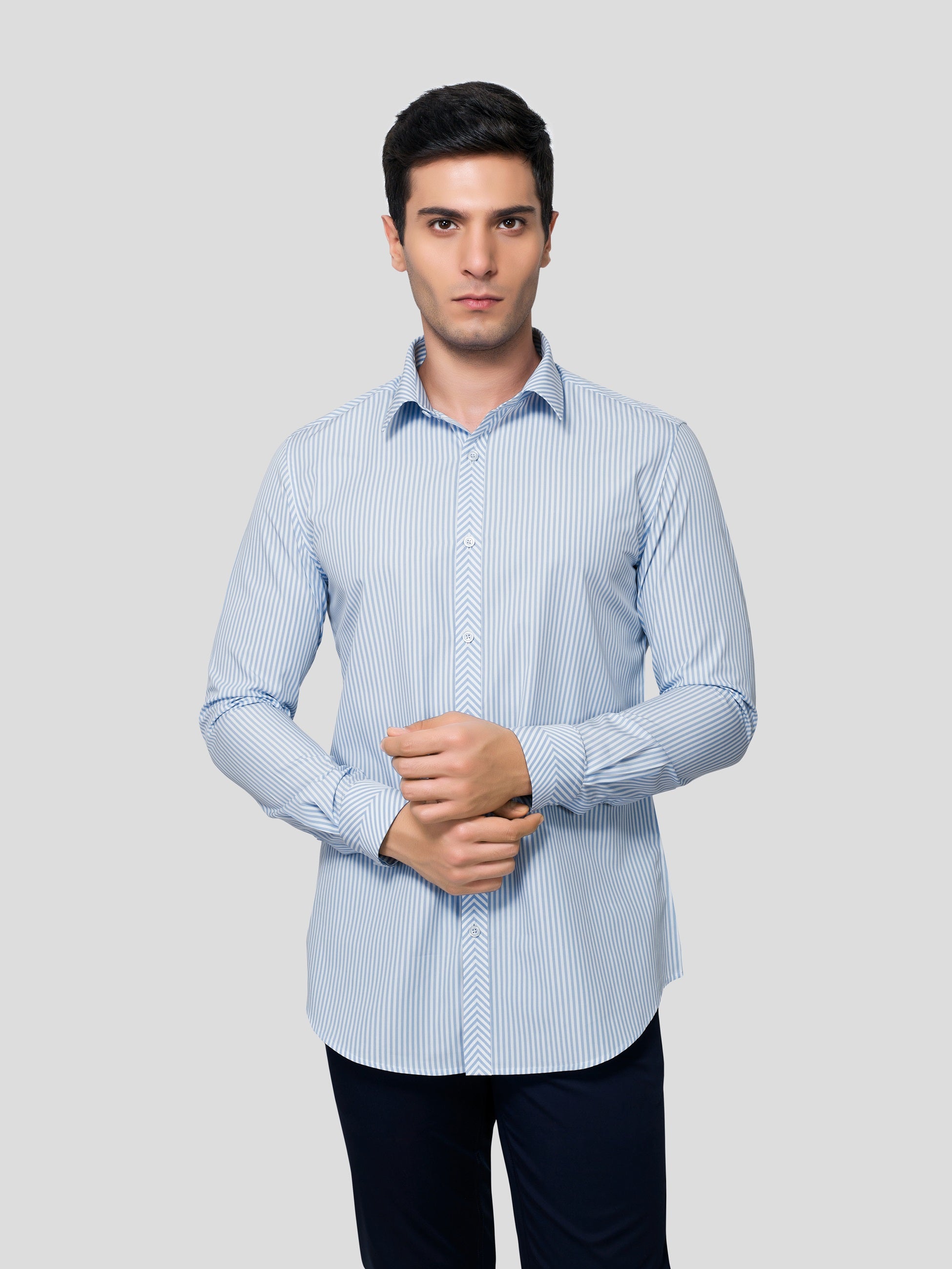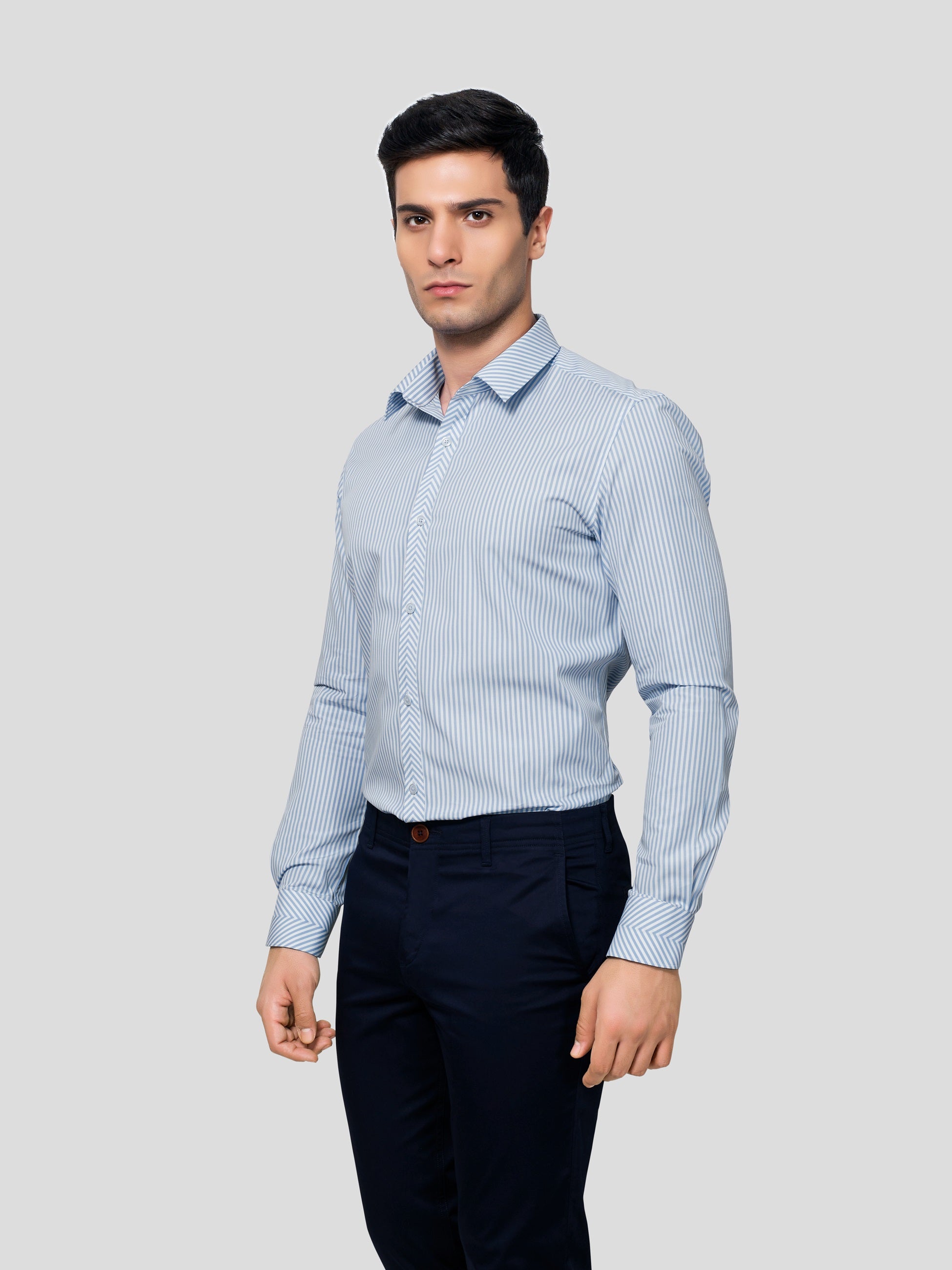 Carry a super exciting look in Chimeric Chevron Yarn Dyed, 50s Cotton shirt oozing with nature’s vibrance. A stylized design where stripes are patterned to look at collar point, the center back yoke, at the center of American placket and at the center of single button cuff. Featuring imported imitation of mother of pearl shell buttons, this shirt is artistically crafted to raise your style quotient several nautches up while letting you feel responsibly fashionized.