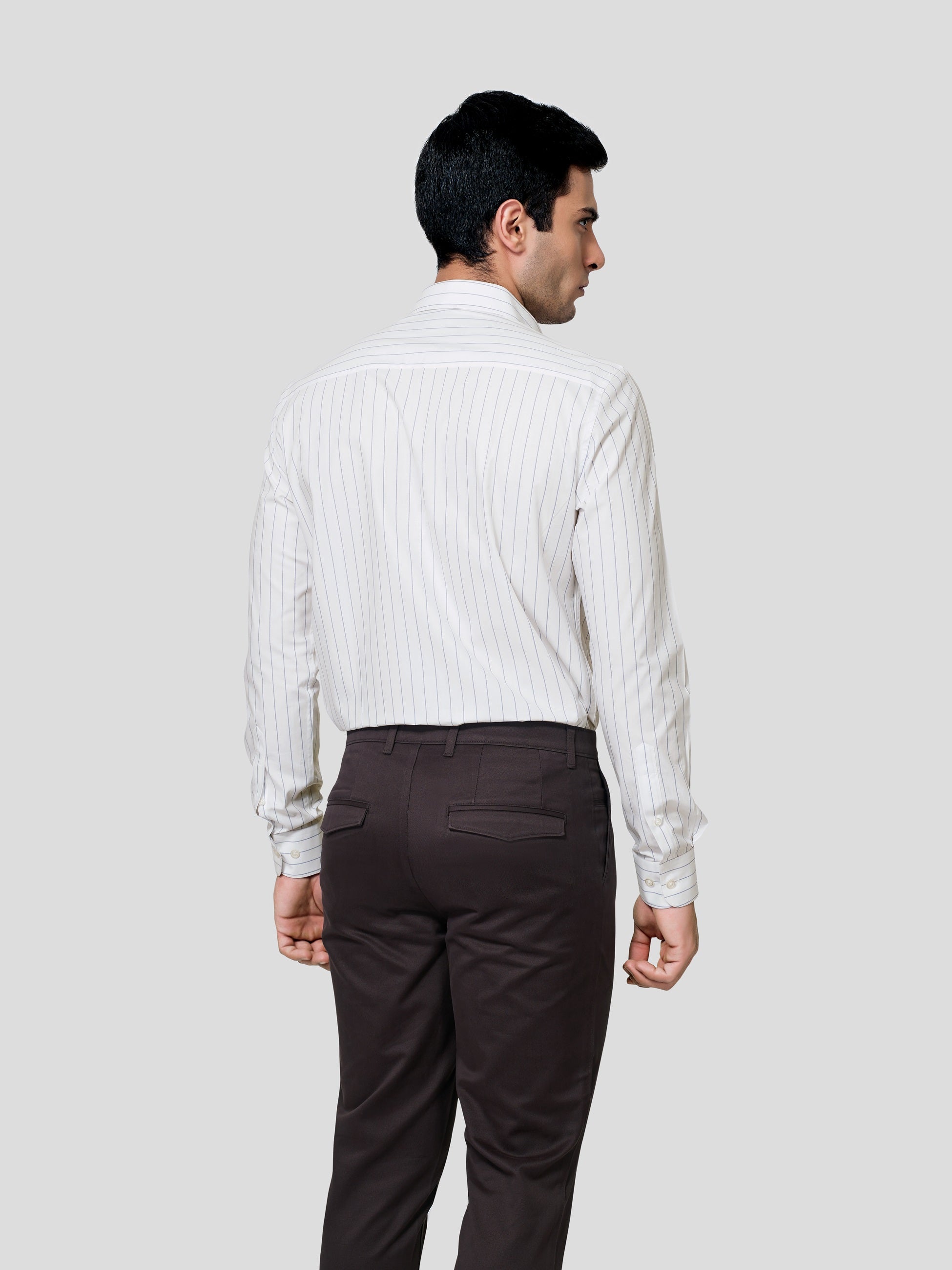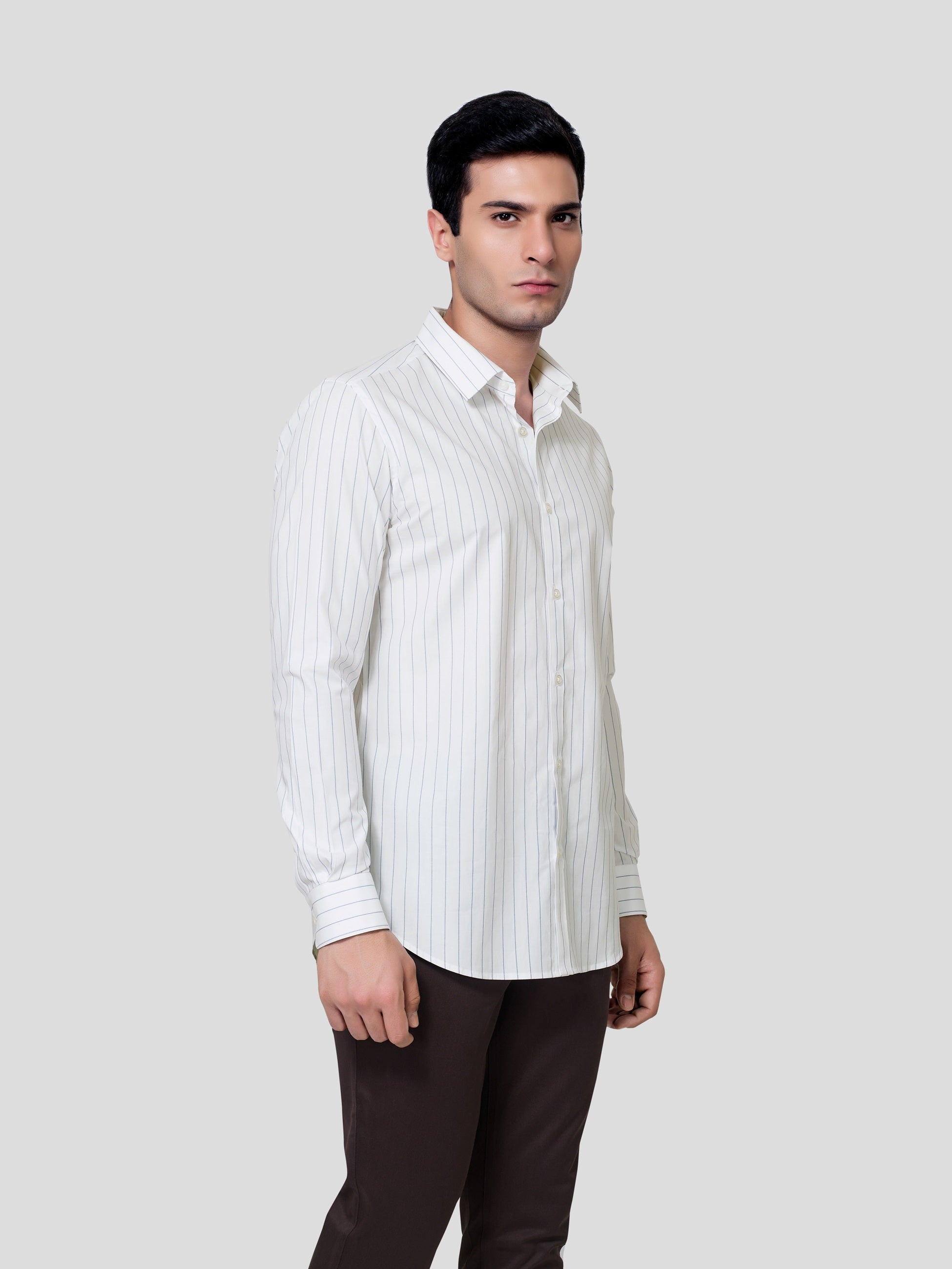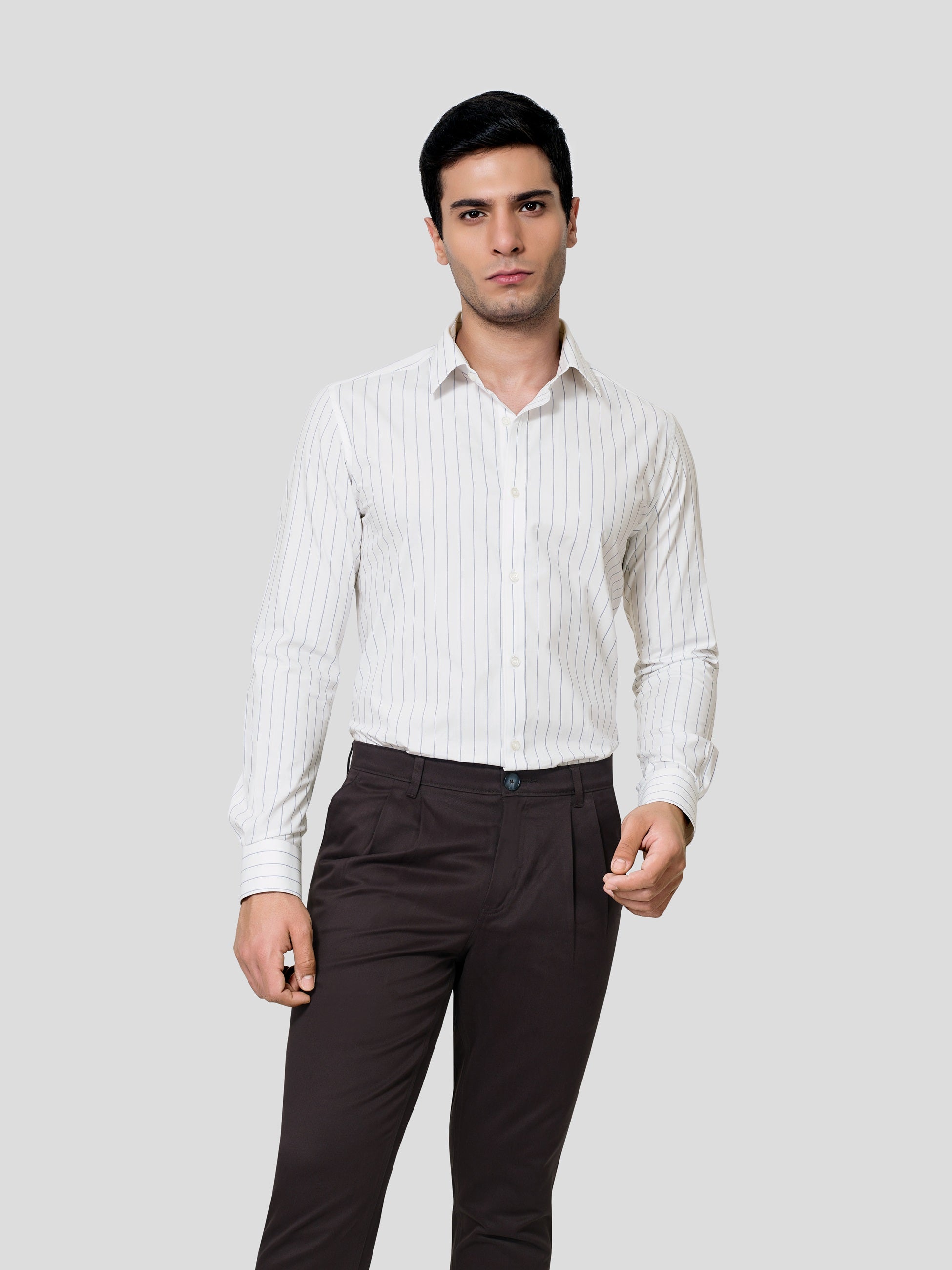 Let the imagination be true, exactly the way you have envisaged in the planning. Our striped 60s Giza cotton shirt is designed with subtle two-color stipes, point collar, American placket and adjustable button round cuff which comes with matching buttons. Celebrate the feelings of excellent craftmanship weaved in earth friendly fabric to give you a formal business look in a responsible fashion.