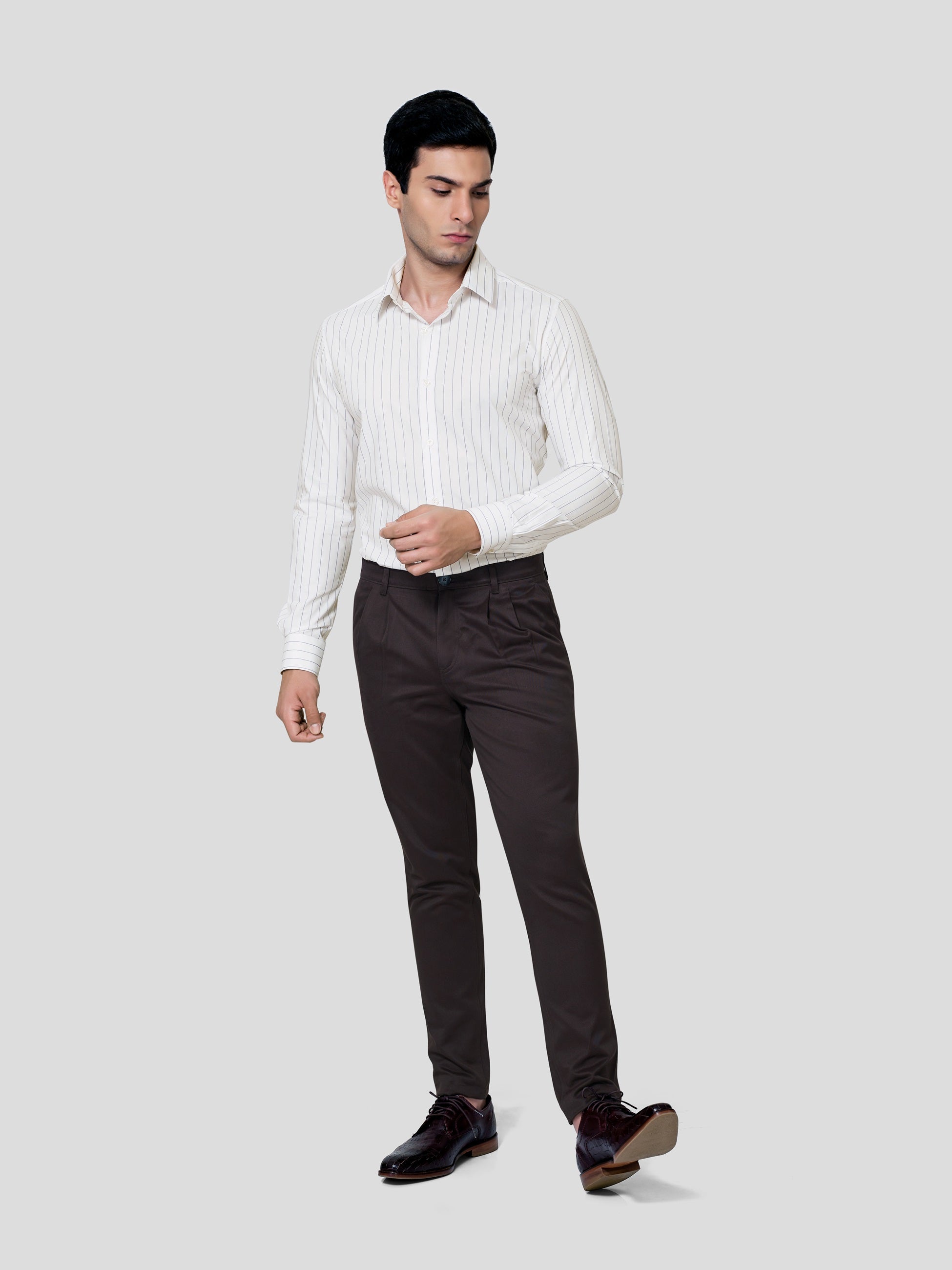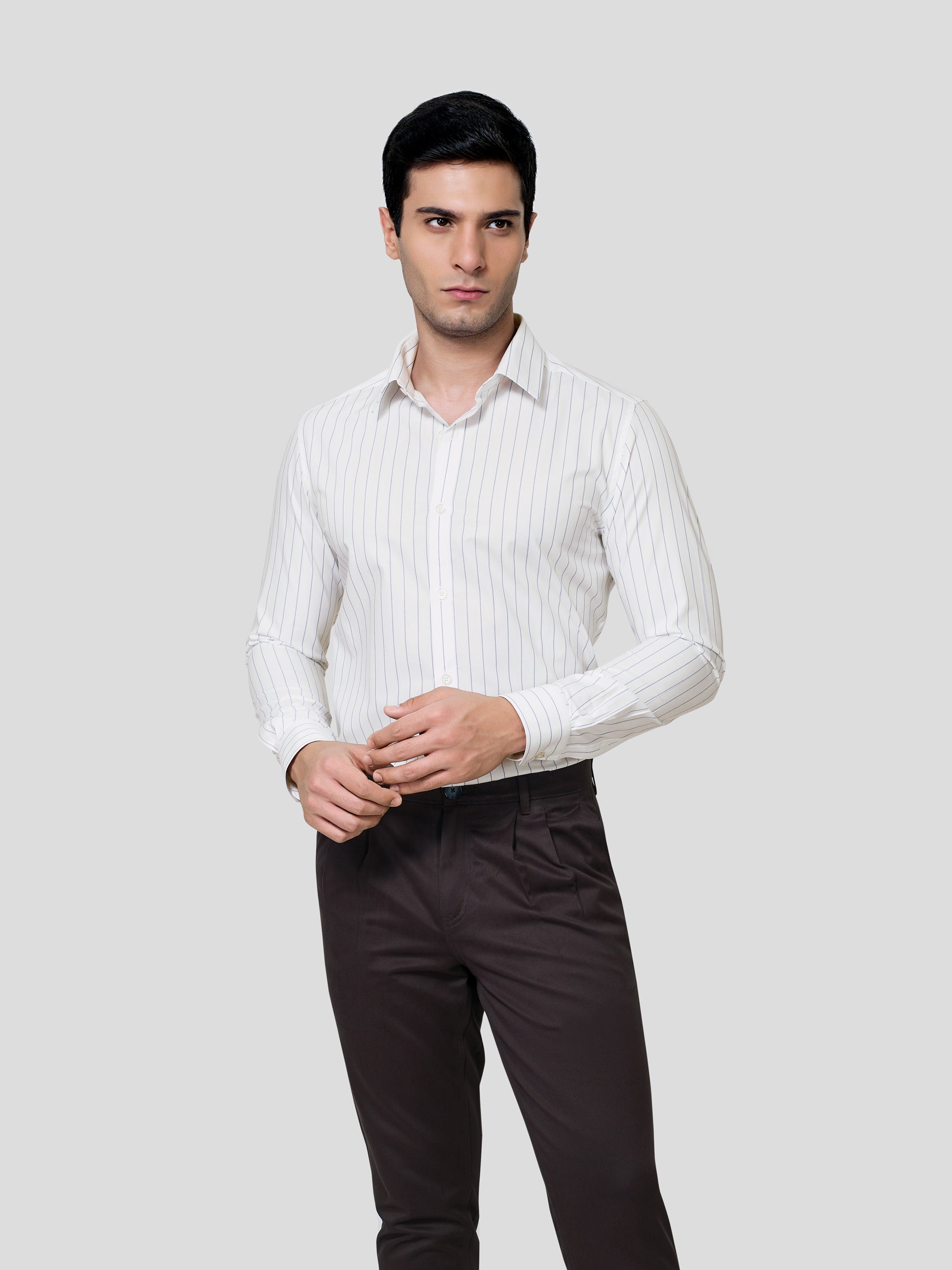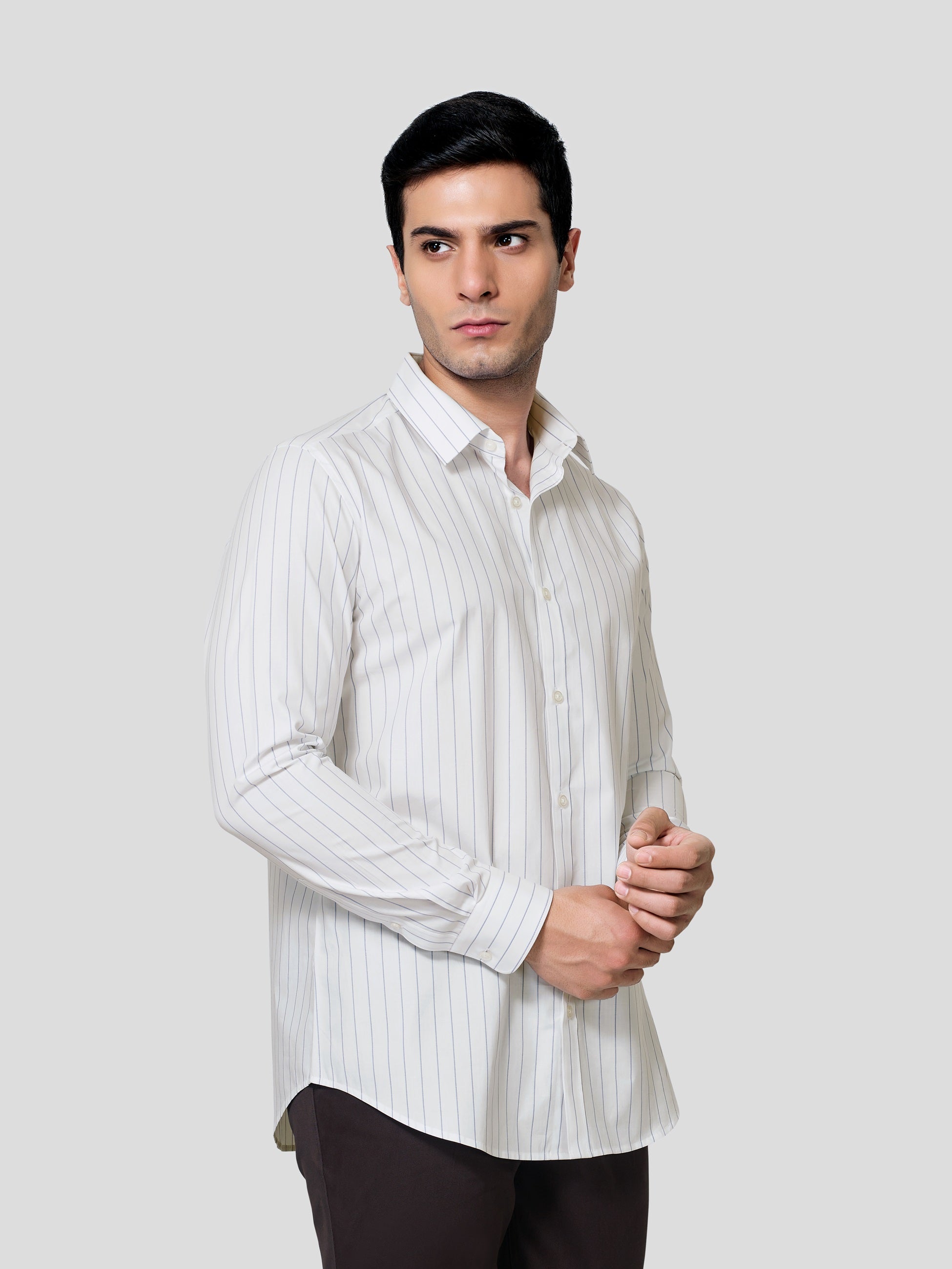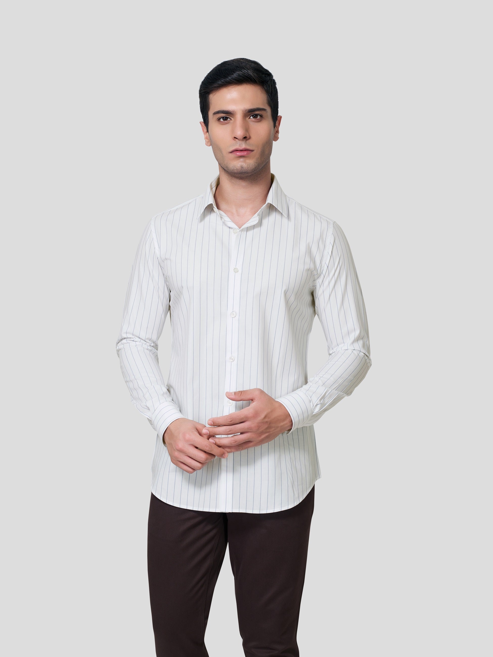 Let the imagination be true, exactly the way you have envisaged in the planning. Our striped 60s Giza cotton shirt is designed with subtle two-color stipes, point collar, American placket and adjustable button round cuff which comes with matching buttons. Celebrate the feelings of excellent craftmanship weaved in earth friendly fabric to give you a formal business look in a responsible fashion.