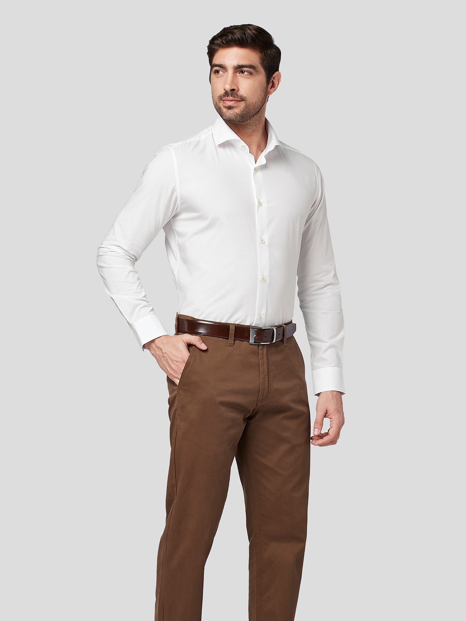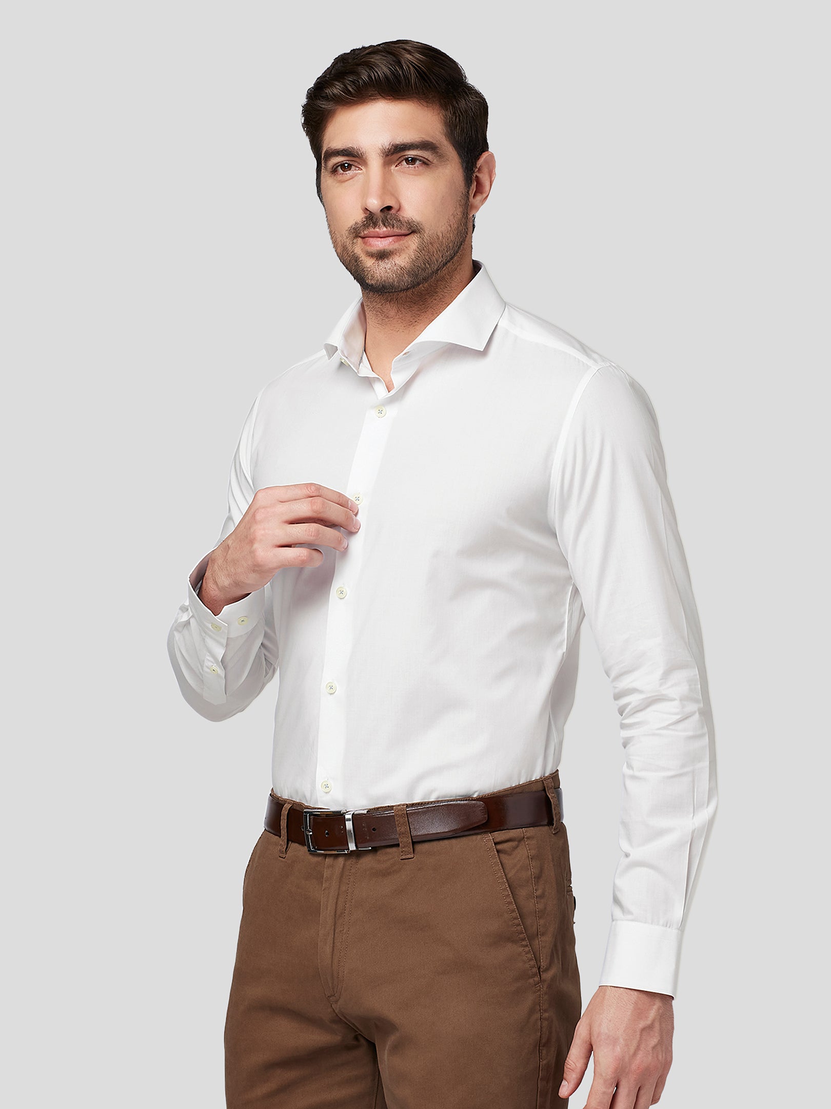 Classic white shirt fit for all occasions, this shirt has been contrast cross stitch on buttons, cutaway collar, angled cuff and French placket. Enjoy the purity of white.